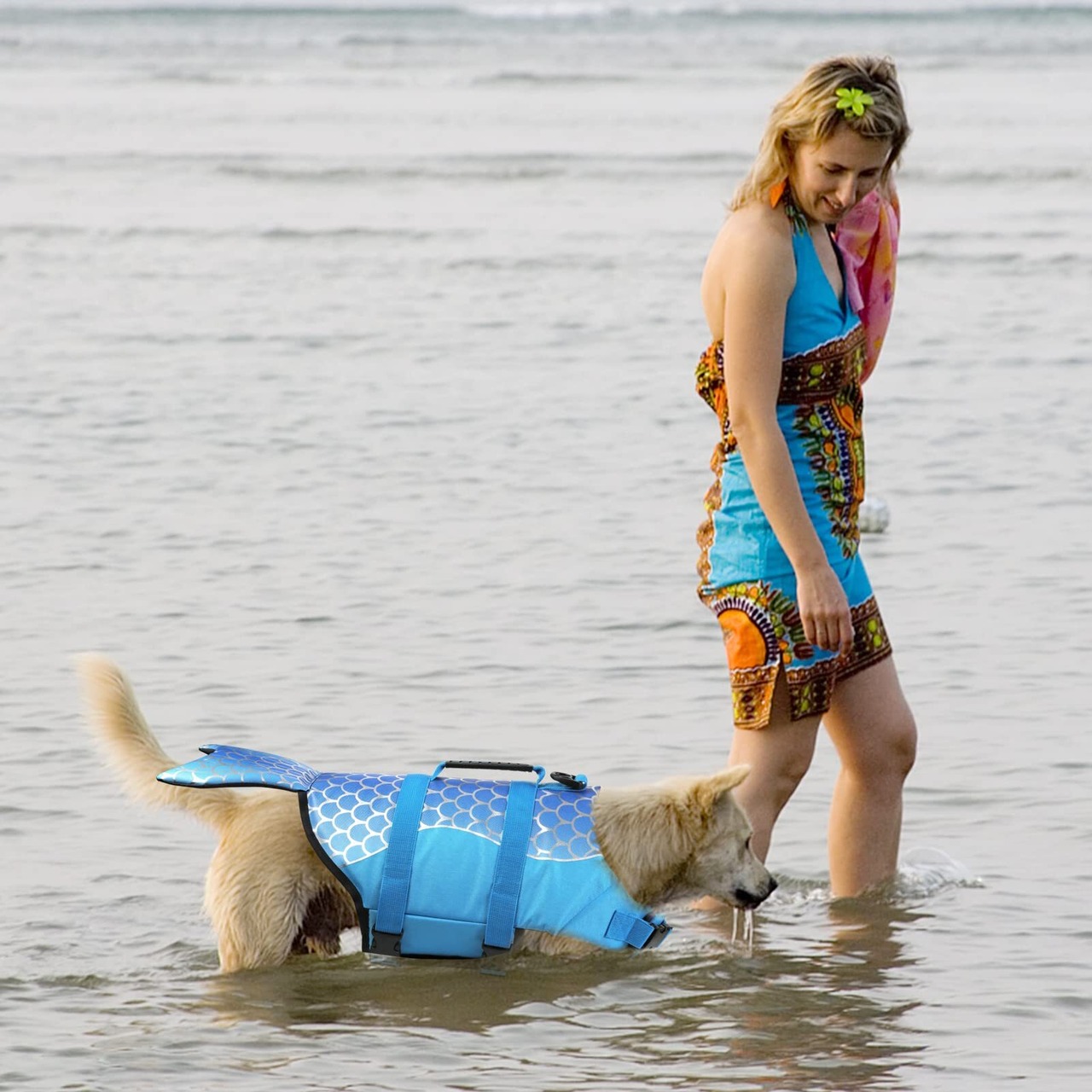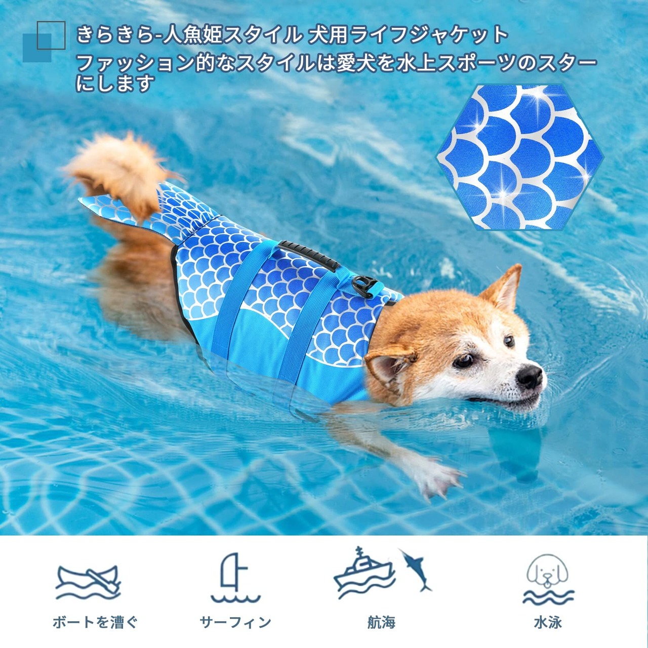 ペット 犬用ライフジャケット 水泳救命胴衣 小型犬 中型犬 大型犬 猫用 救急服 水遊び用 運動用 犬 水泳必需品 犬の安全を守る 保護 高浮力 反射ライン 干しやすい (きらきら人魚姫 ブルー, L)