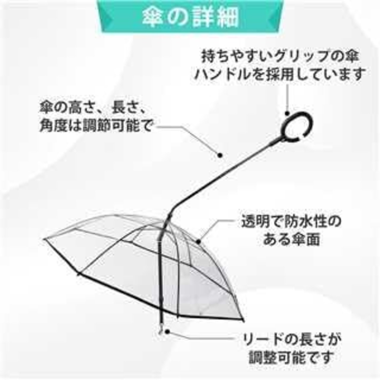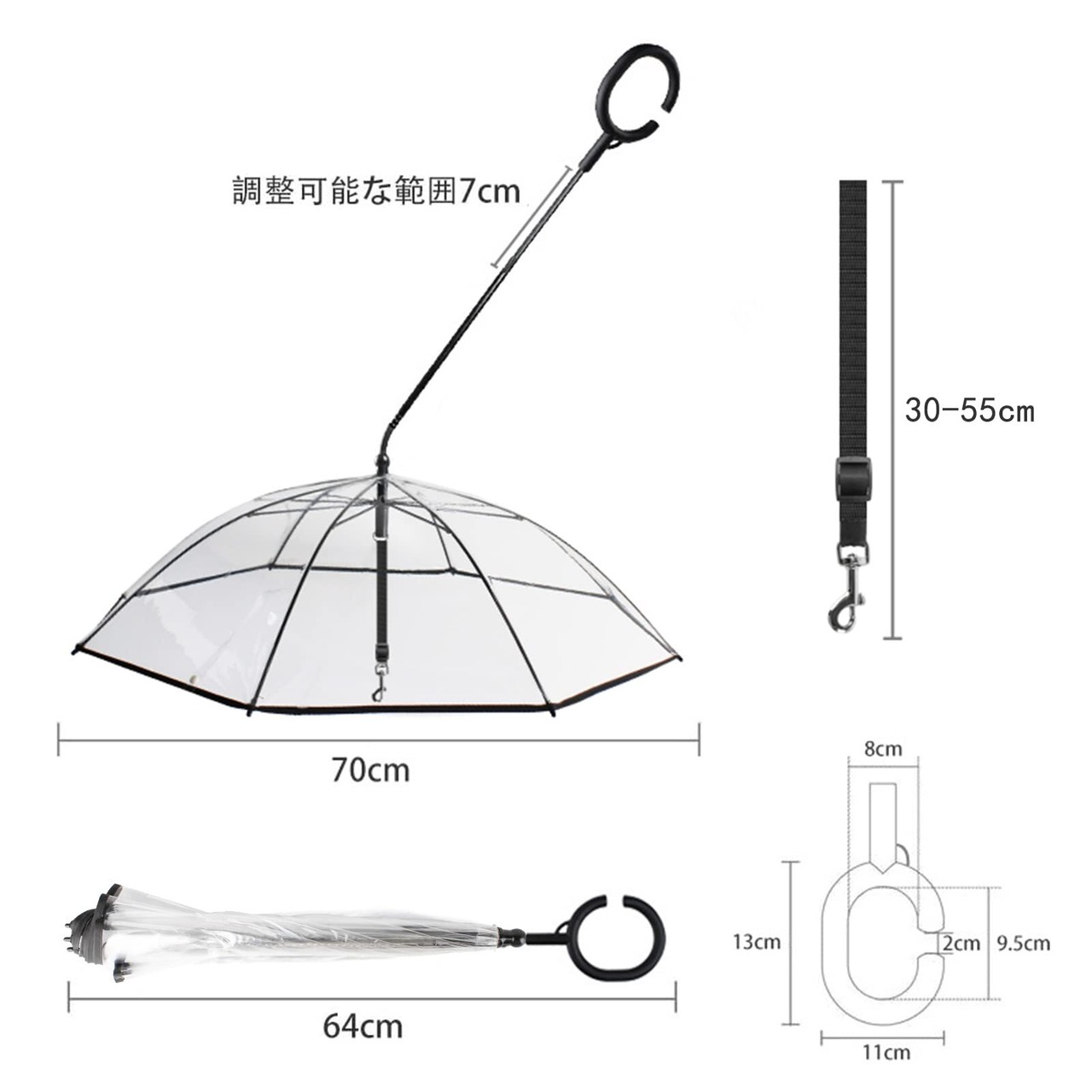 調節可能なナイロンロープのストラップを内蔵し、ペットの体長に合わせて長さを調節できます。傘の直径は70cm、傘のシャフトの長さは64cm以下に調整可能です。51cm未満の犬や小型ペットに使用可能です。購入する前に、サイズがペットに対応しているかどうかをご確認ください。傘が届いた時、傘ビニールに白い粉がついても心配しないでください。それはビニールのくっつき防止のためです。拭き取ってからご使用ください。