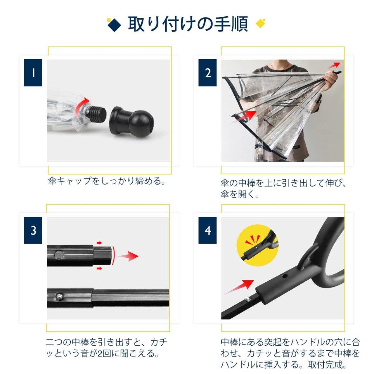 組み立て時は説明書をよくご覧ください:1. 傘かさ帽子を取り付ける。2.傘を上向きに広げて開きます。3.傘の二つの中棒を引き出します。中棒を引き出すときに、カチっという音が二回鳴ります。4.中棒の突起をカチっという音が鳴るまでC字型持ち手に挿入すれば、組み立て完了です。