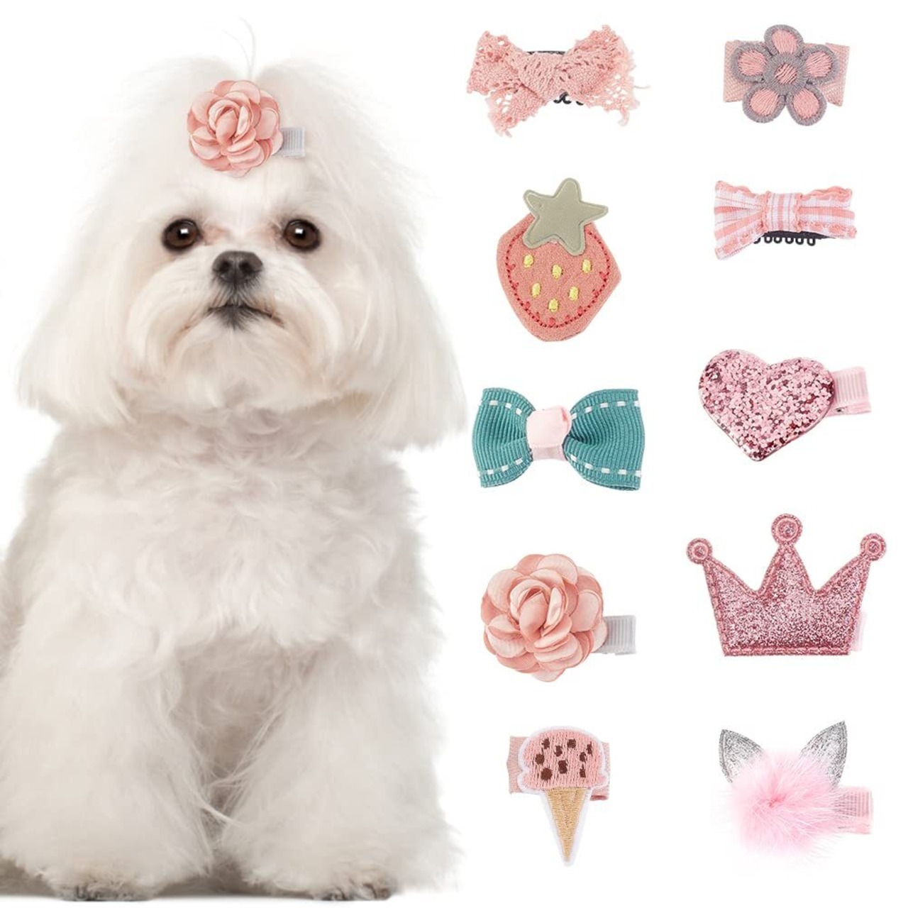 パッケージ内容:犬のヘアクリップが10個付属しています。王冠、イチゴ、ハート、リボン、花など、さまざまなスタイルがあなたのニーズを満たすのに十分です。