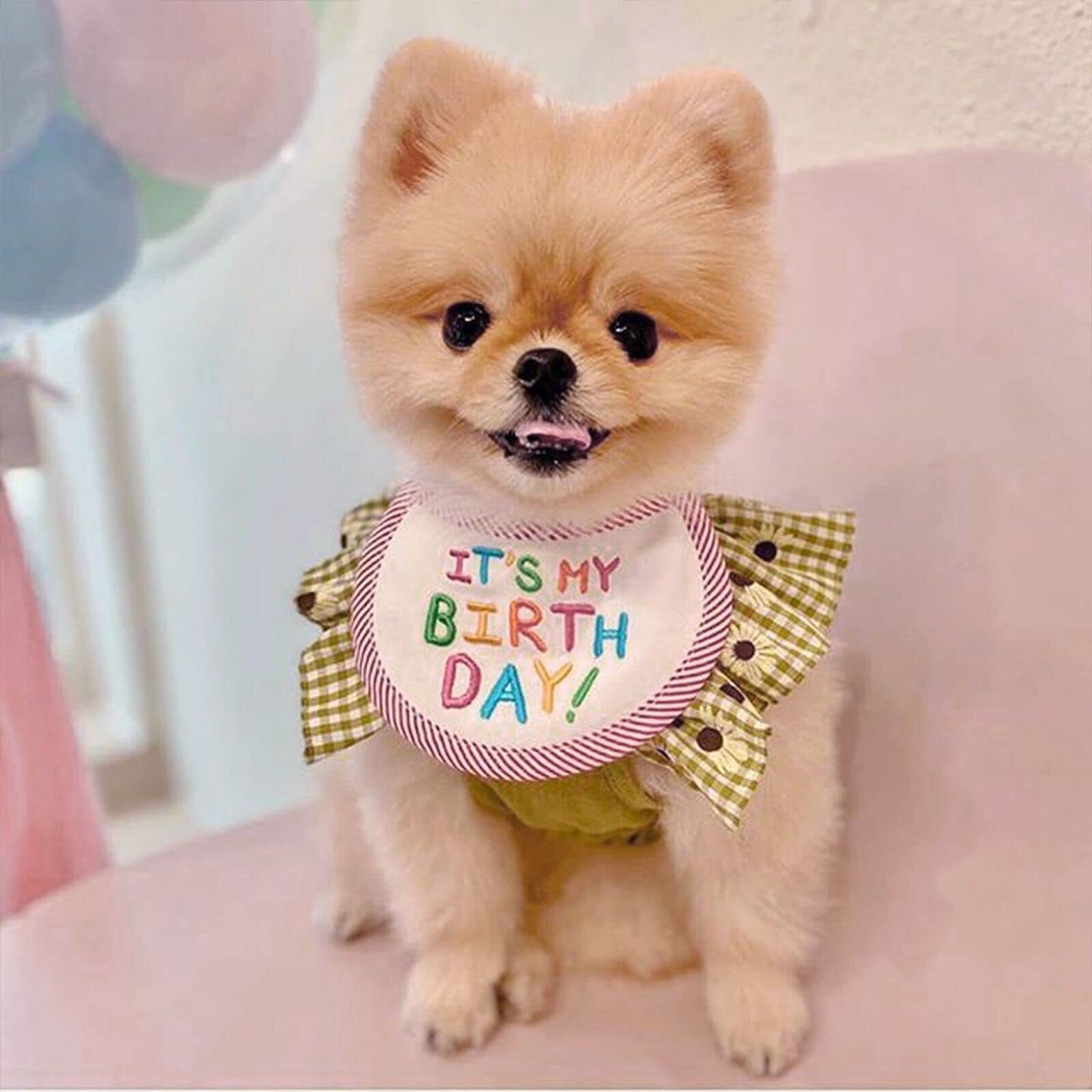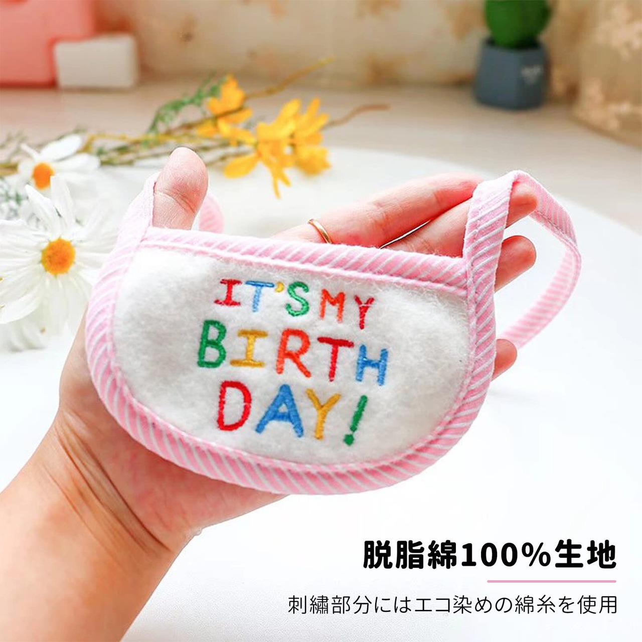 ペットの誕生日のお祝いに使えるよだれかけです。見た目が可愛いのでおしゃれなワンポイントになります。
