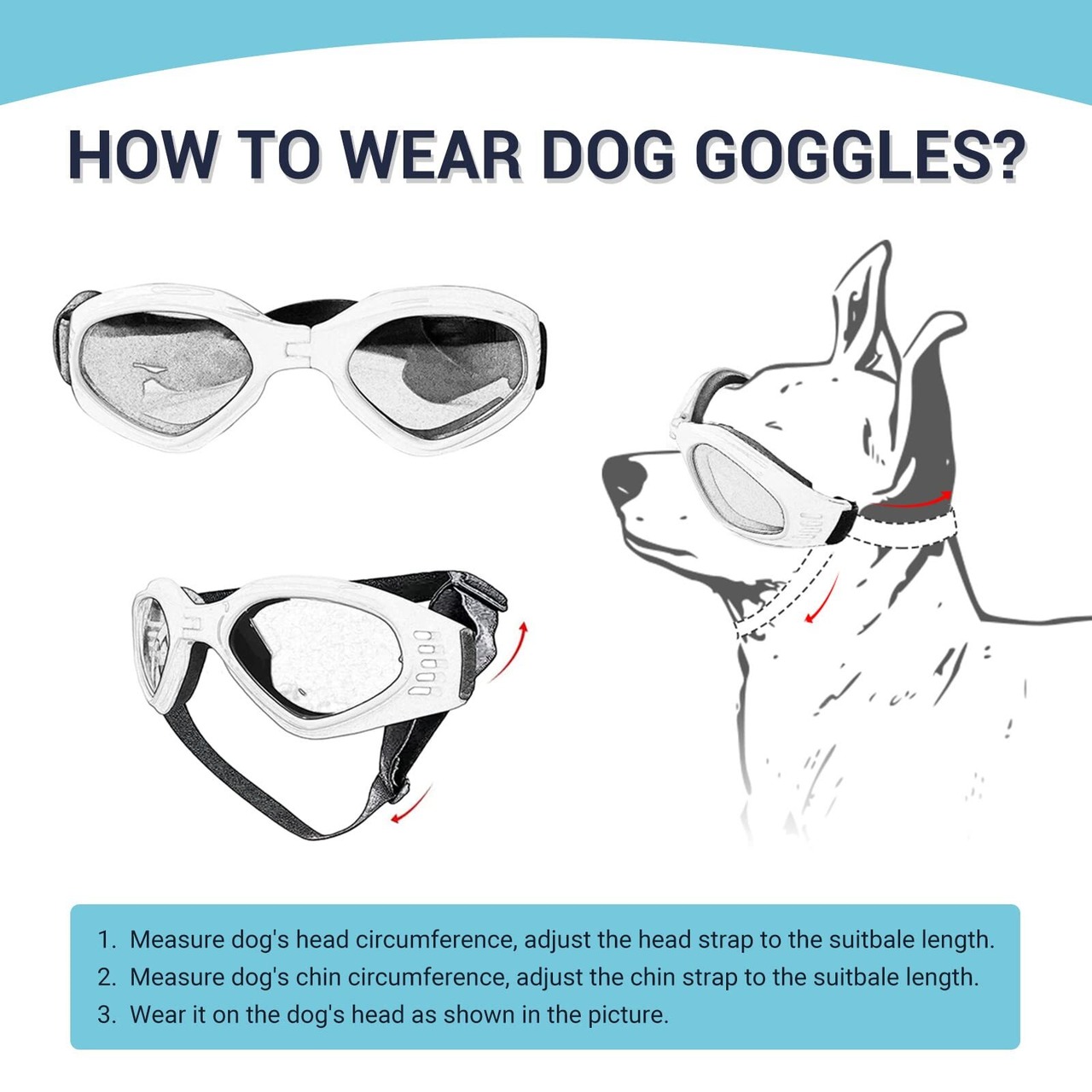 装着ヒント:最初着用する時、抵抗する行動があると思い、ペットを楽になるサイズまで調整してください。おやつをご褒美として与えるなどの手段で、ペットにメガネのかけることを慣れるまで訓練しよう。