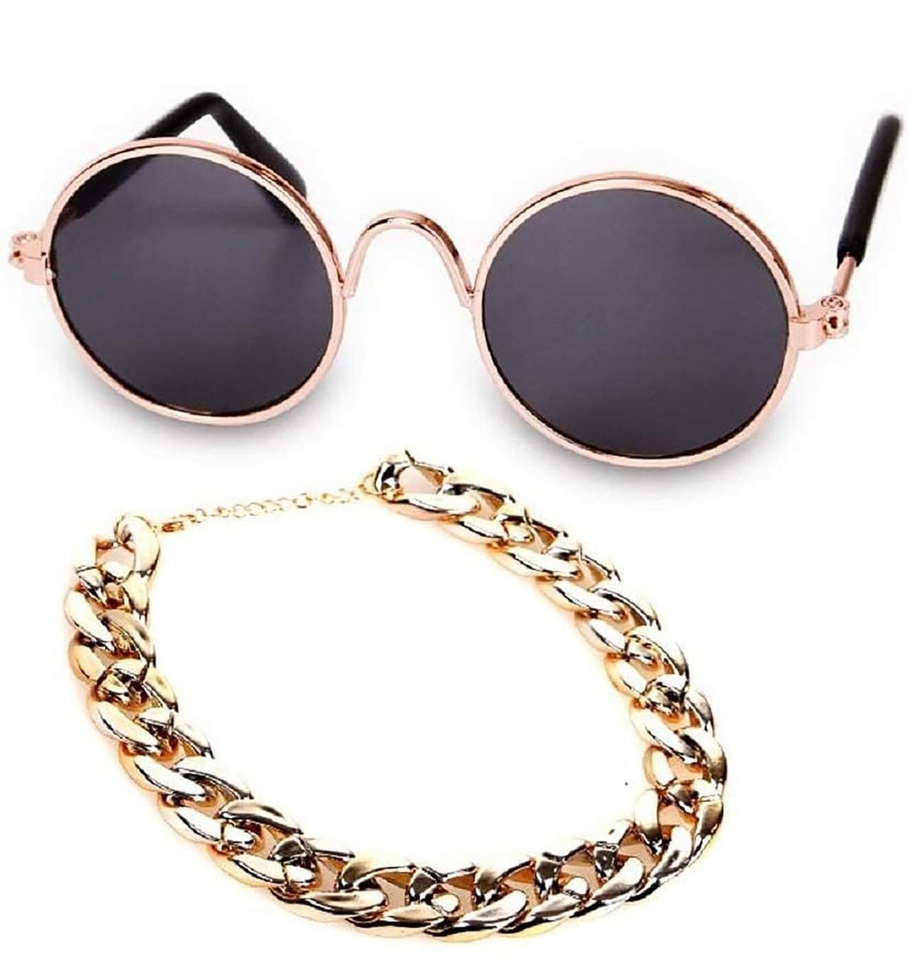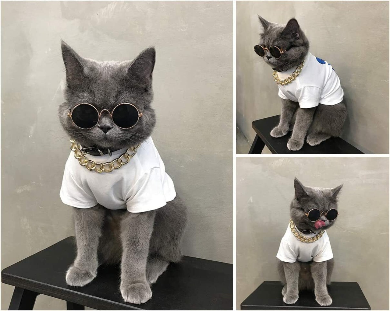 猫のサングラスゴールドのチェーン麦わら帽子ネクタイ定番レトロ趣味プレゼントペットの猫の子犬の中サイズ子犬の誕生日コスプレパーティー週末 (サングラス+ゴールドチェーンカラー)