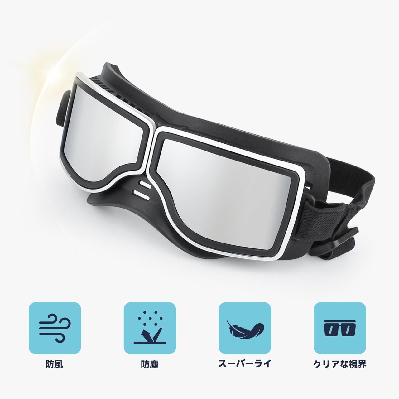 PETLESO 中型犬用ゴーグル、紫外線対策、防塵、防風、サイズ調整可能犬用サングラス、アウトドアサイクリング用ゴーグル、シルバーレンス、黒いフレーム
