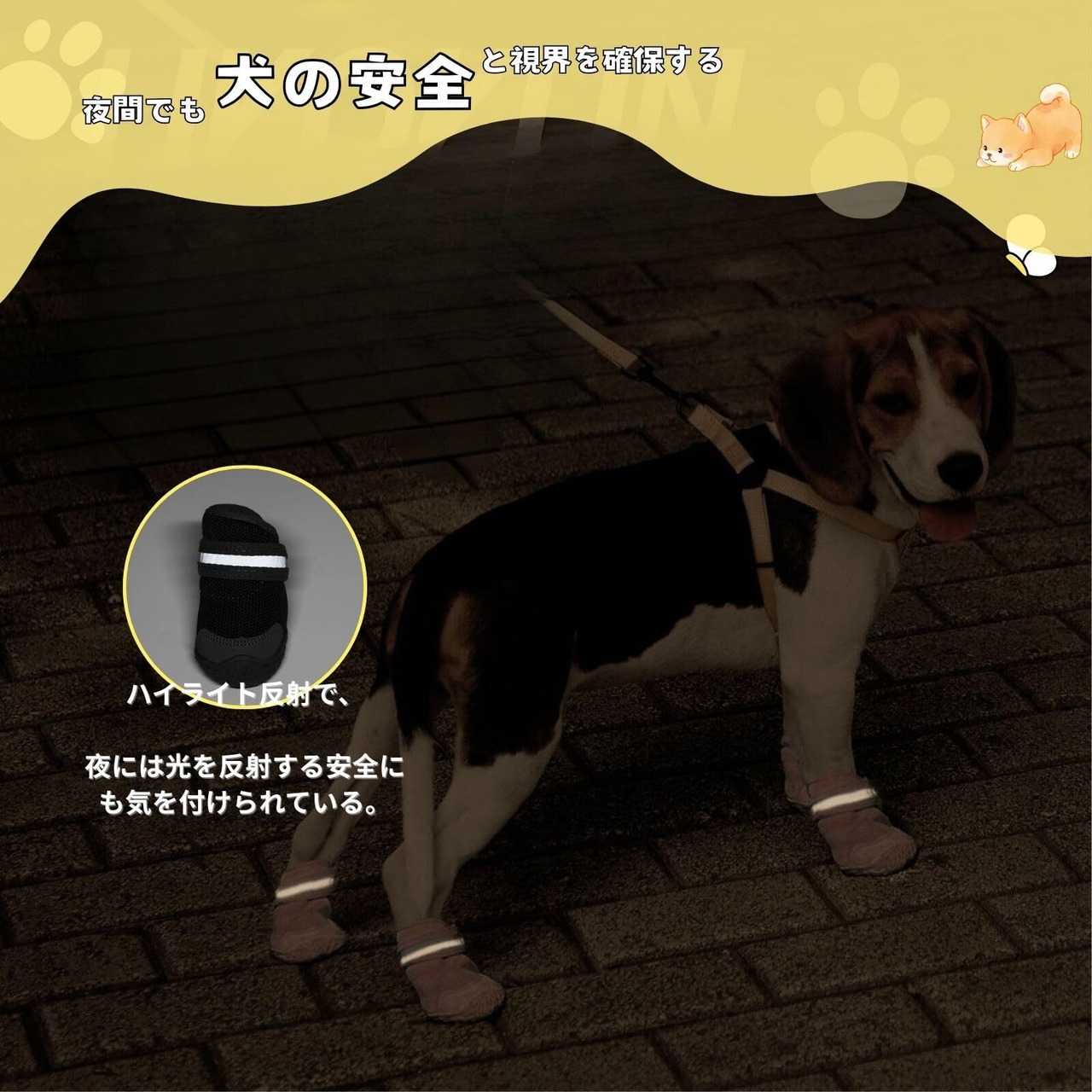 【反射マジックテープ、安全性アップ】 ハイライトの反射マジックテープで、夜には光を反射する安全にも気を付けられている。メッシュで軽いことと、ぐにゃぐにゃ曲がる靴底が特徴で、ワンちゃんは何も履いていないかのように使う。
