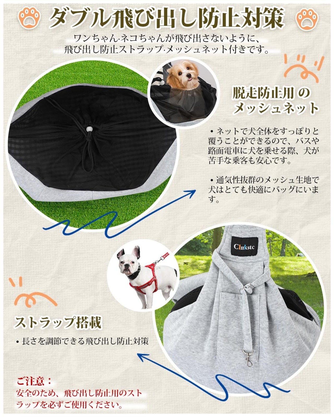 【2つの飛び出し防止仕様】ペットスリングに飛び出し防止用のナスカンとメッシュネットがついています。猫と犬が首輪をつけるの場合、ナスカンを首輪につけて、ペットを保護すると同時に活動のニーズにも応えることができます。スリング内部は通気性の良い飛び出し防止用メッシュネットが付いており、快適性と安全性を両立させています。