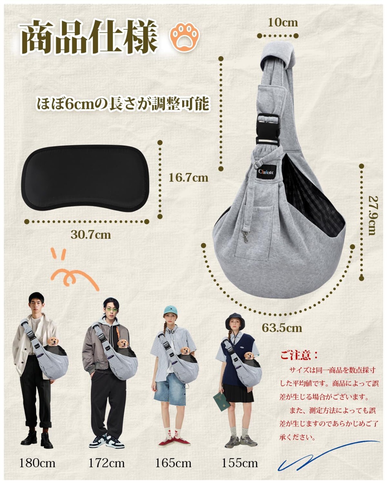【調節機能付きワンタッチバックル】肩ひもの長さは調節できますので、使用する飼い主さんの体形に合わせることが可能です。肩掛け部分の幅は10cmと広めです。愛犬を入れたときに重さを感じにくく、安定感がある作りとなっています。