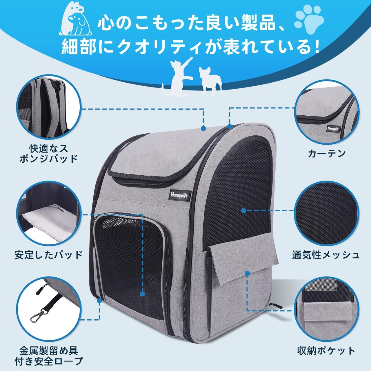 Honeypet ペットキャリーバッグ 猫バッグ 犬キャリーリュック 8kg耐荷重 通気性 安定性 折り畳み収納 カーテン付き 携帯便利 犬/猫/小動物適用 旅行 通院 散歩 電車移動 災害避難用 外出用 ペットバッグ (グレー)