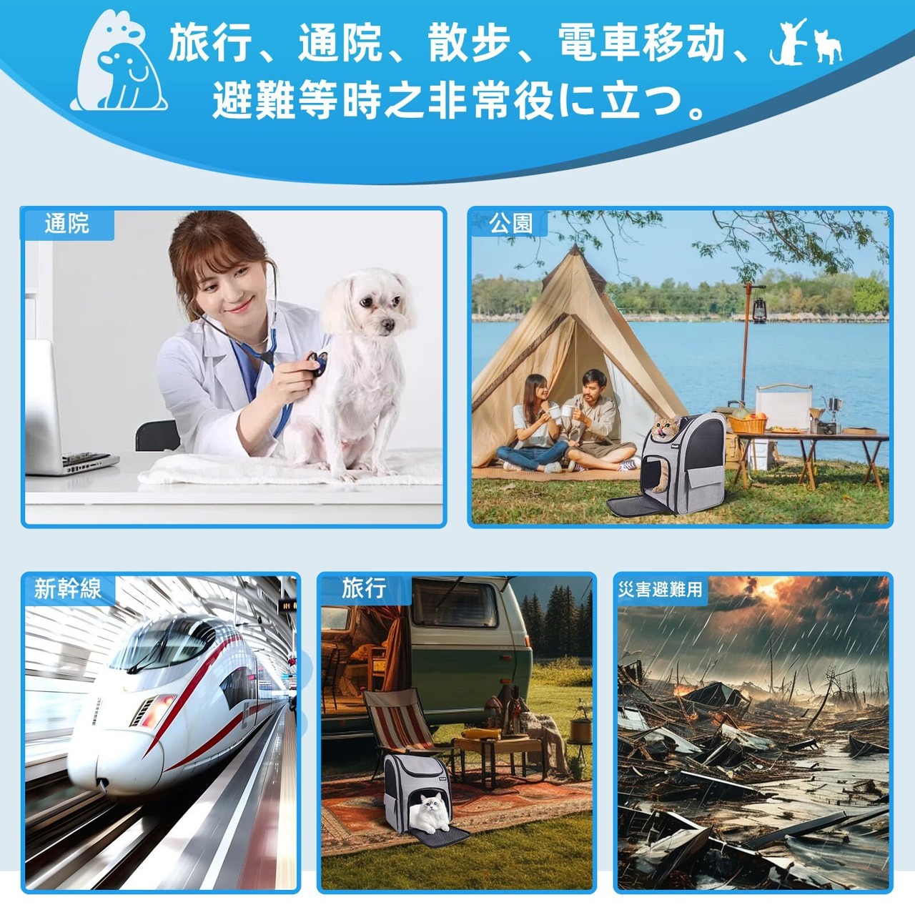 【使用の便利さ】複数の出入口により、ペットがバックパックの出入りを容易に行えます。両側の収納ポケットには、財布、スマートフォン、ペットの医療カード、ペットのおやつ、おもちゃなど、さまざまなアイテムを収納可能です。ダブルショルダーバックパックは両手を解放し、背面には通気性の良いクッション材を採用し、背負い心地を向上させます。