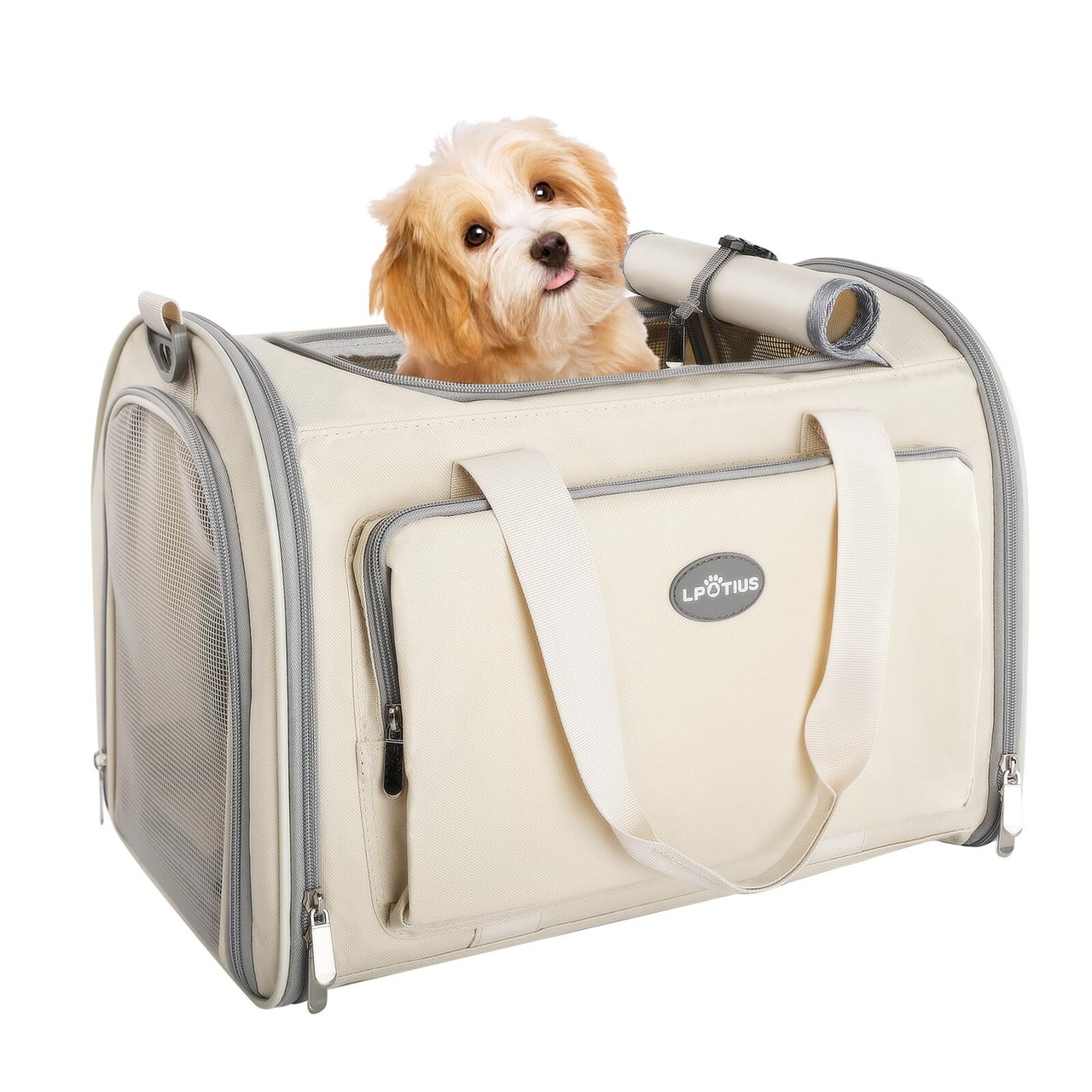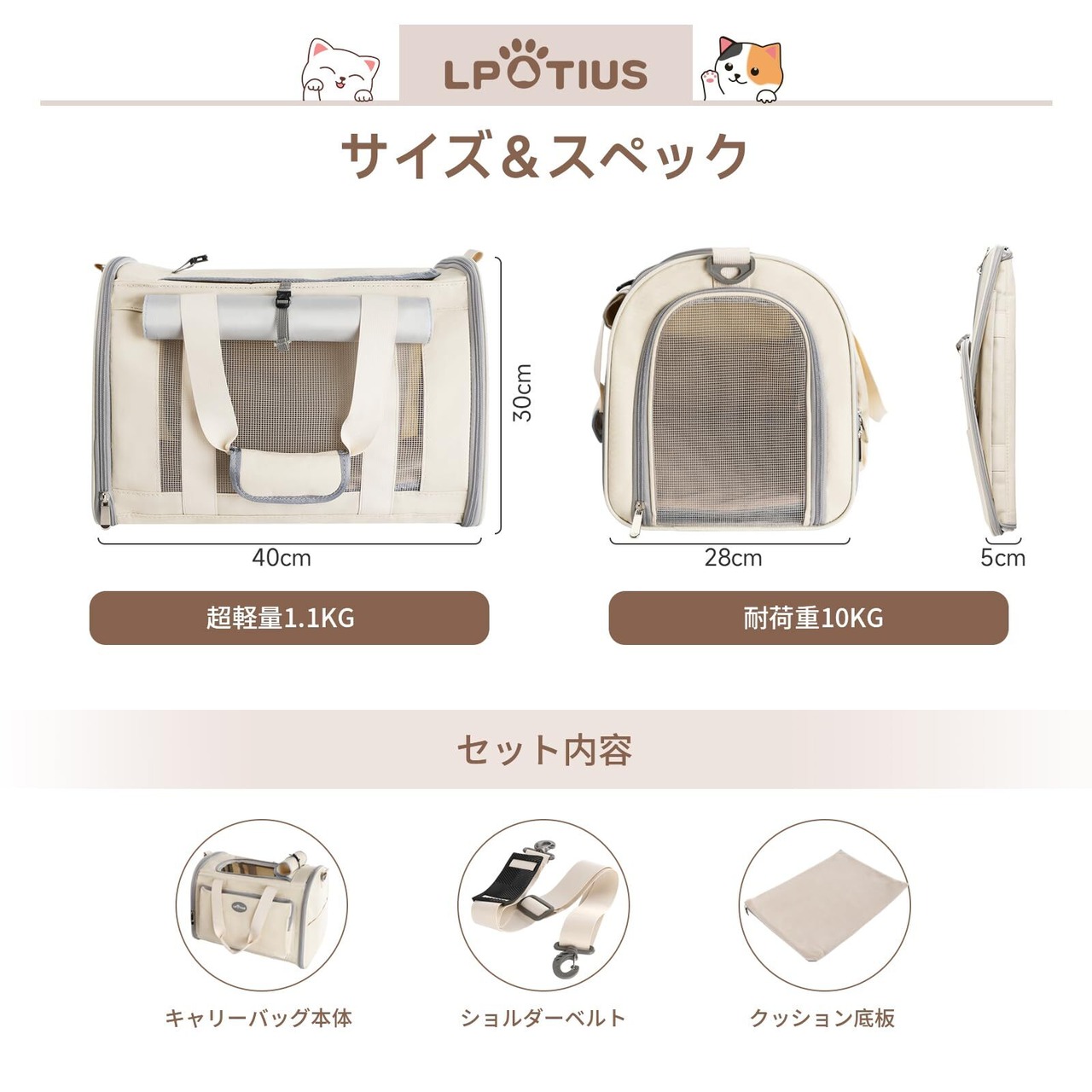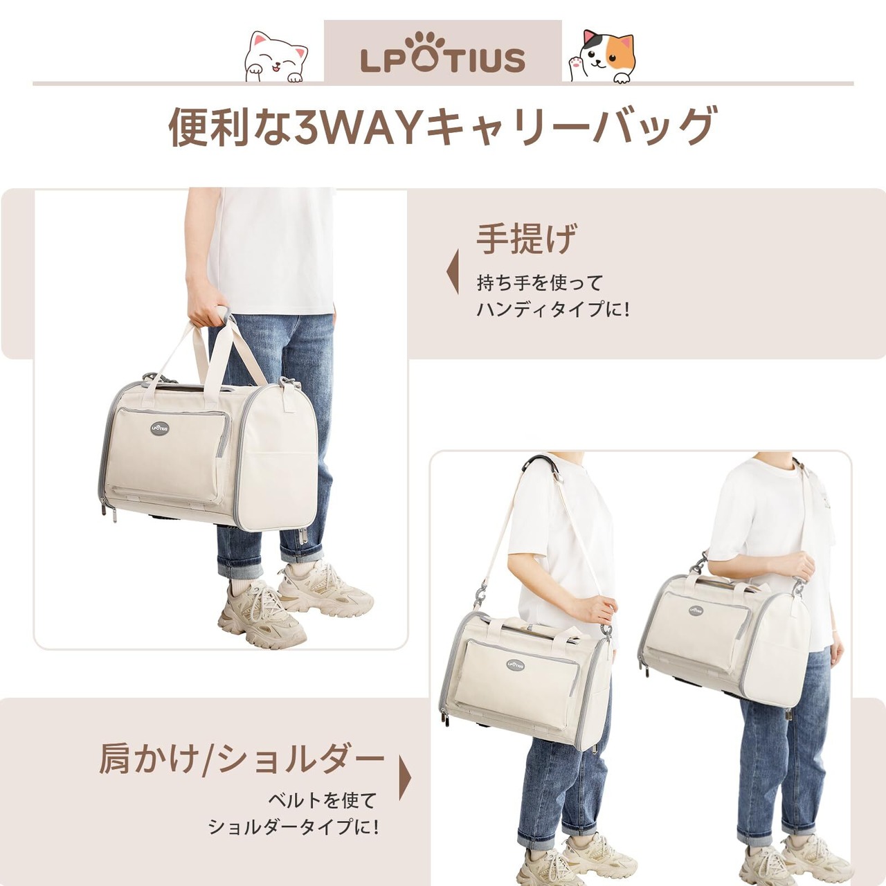 LPOTIUS ペットキャリー バッグ 折り畳み 2way 猫 小型犬 キャリーバッグ 軽量 3面通気 洗える 猫 キャリー 犬用キャリーバック 飛び出し防止リード付き ペット用 キャリーケース ベルト脱着可能 お出かけ 車載 旅行 通院 電車移動 災害避難に最適 耐荷重8KG (エクリュ)