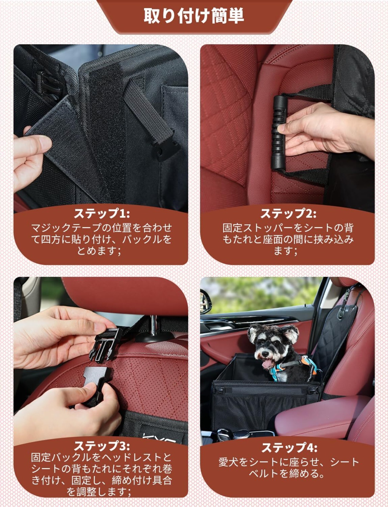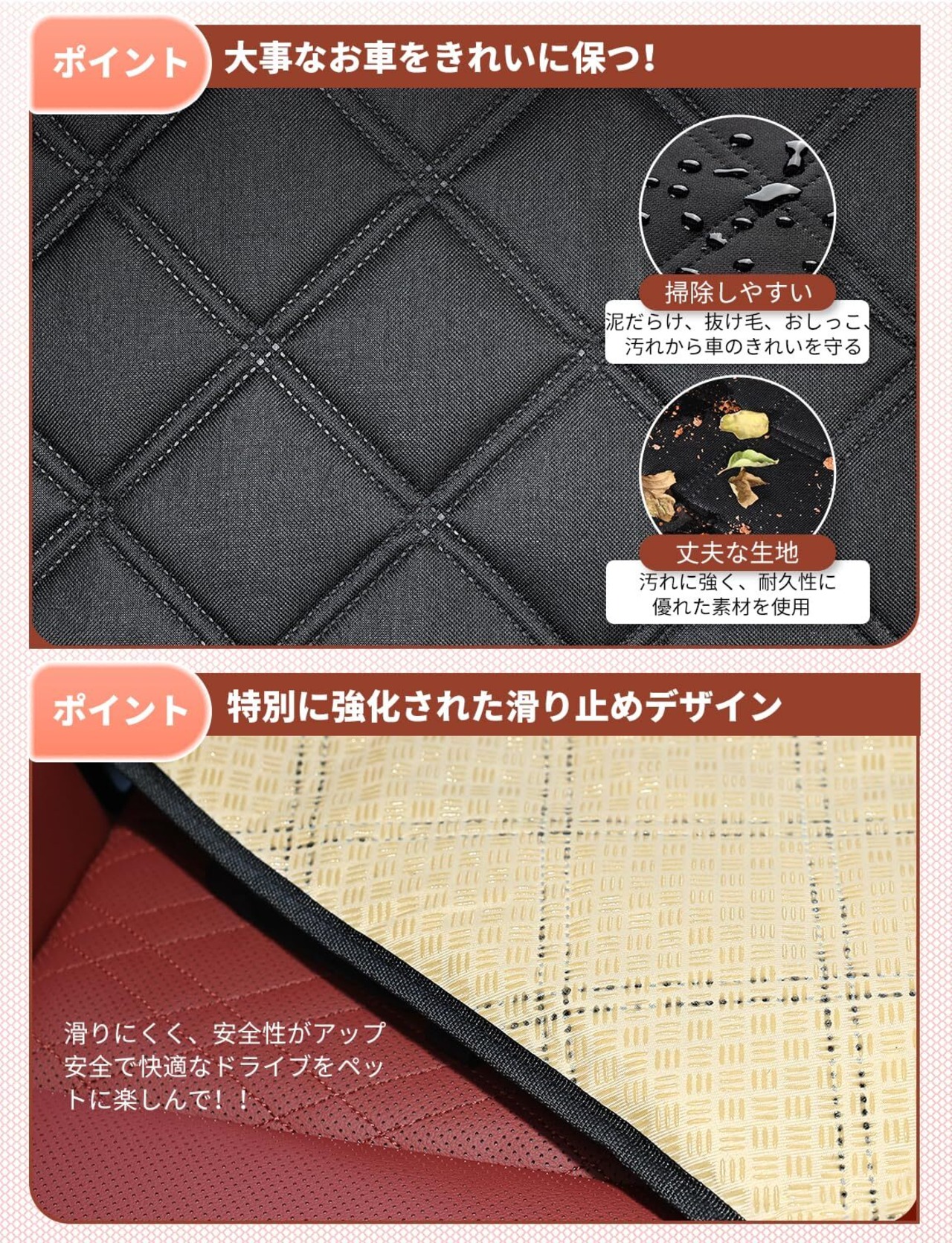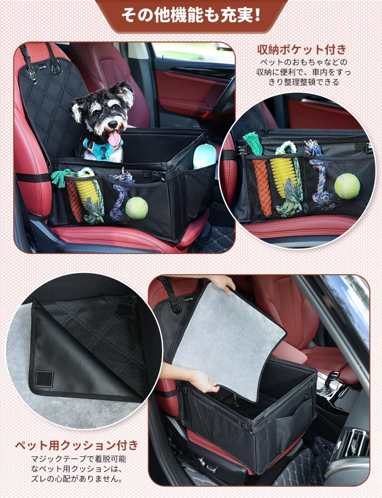【主人が安心して運転できる】飛び出し防止リード付きなので、カーブや急ブレーキなど際に、ペットの体をしっかり支え、瞬間の飛出しを防ぎます。背面には2本の固定用のベルトつきなので、座席の背もたれとしっかり固定できます。車酔い防止にも効果抜群です。