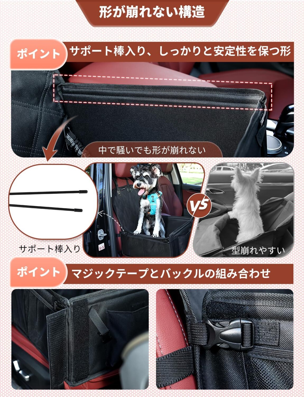 【丈夫で型崩れしない】運転中、飼い主がペットのあんぜんを心配する必要はないように、ボックスがサポート棒入りで支えられています。丈夫で型崩れしなくて、安定性が抜群です。さらに、四角はバックルで固定して、また安定性が向上されます。