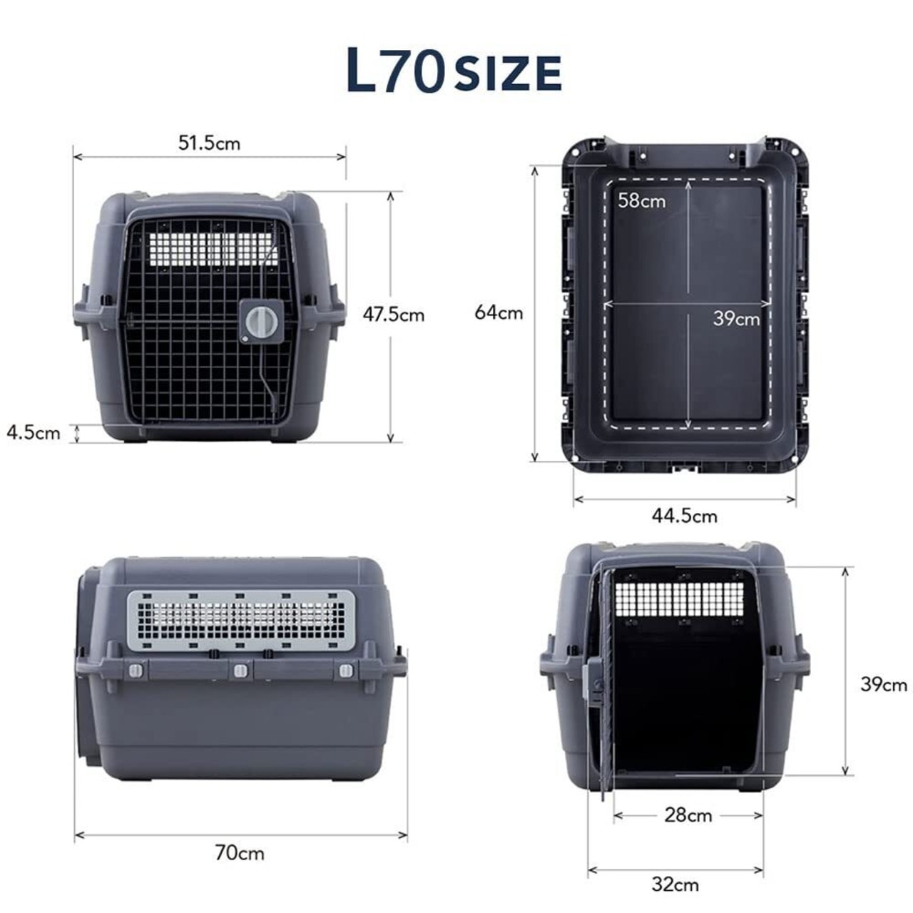 L70サイズ(約):【外寸】幅51.5×奥70×高47.5cm【内寸】幅44.5×奥64×高42.5cm【底面】幅39×奥58cm【入口】幅28×高39cm●重量(約):5.8kg●耐荷重(約):~16kg●材質:【ケージ】ポリプロピレン【ドア、窓】スチール ●生産国:中国(企画・デザイン:中国) ●メーカー:株式会社オーエフティー