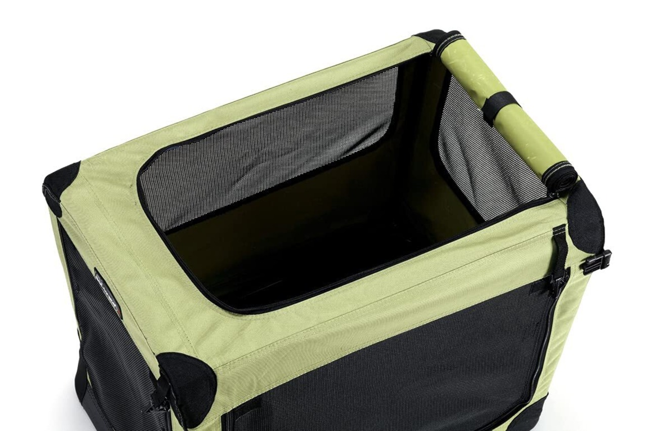 折りたたんで持ち運び可能な布製ペットケージ。Mサイズ。ワンタッチで組み立て、折りたたみできるスライド・ホールディングシステム。金属フレームを使用し、高い強度を実現しました。底面には防水のビニール生地を使用。地面からの水や湿気が内部に入り込まないので、直接地面に置いても大丈夫。本体カバーは取り外して丸洗いもOK! 汚れが拭き取りやすいよう内側は撥水加工されています。天面ドアと正面メッシュドアは巻き上げてマジックテープで固定できます。対応ペット参考体重:13.6kg。シーズー、ミニチュアダックスフンド、トイプードル、コーギーなど