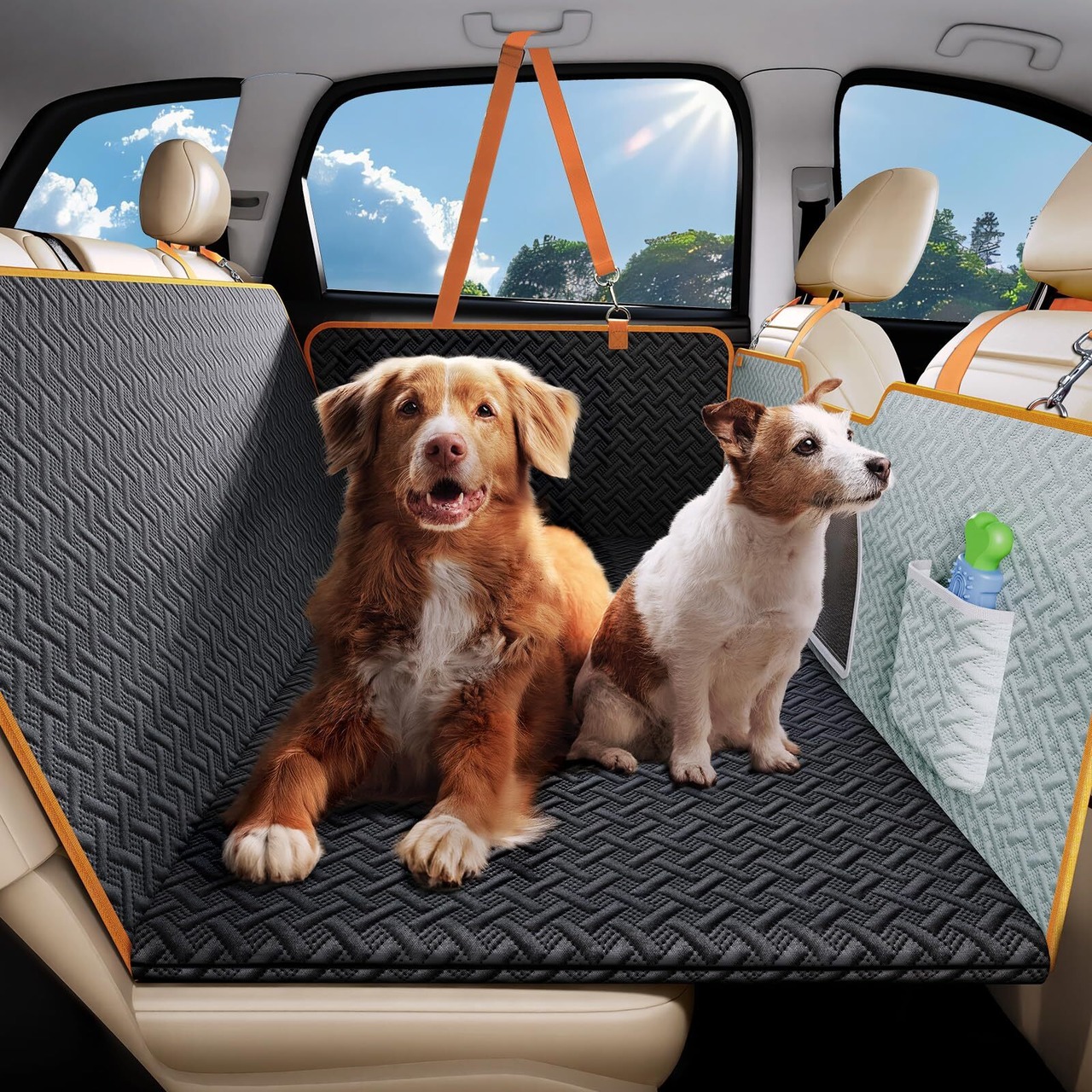 【可視メッシュ窓・通気性・収納できるポケット】車 ペットシートには窓を設計し、空気循環を促進し、通気性を強化し、ペットの不安を緩和します。両側の袋はペットのおもちゃなどの小物を収納できます。