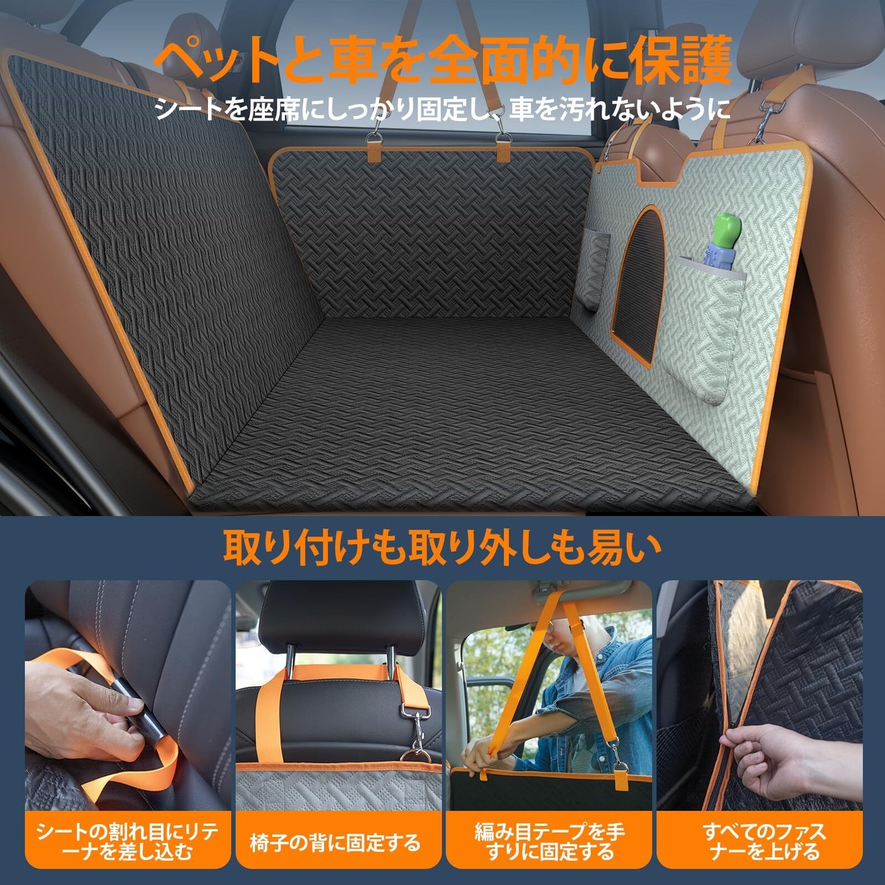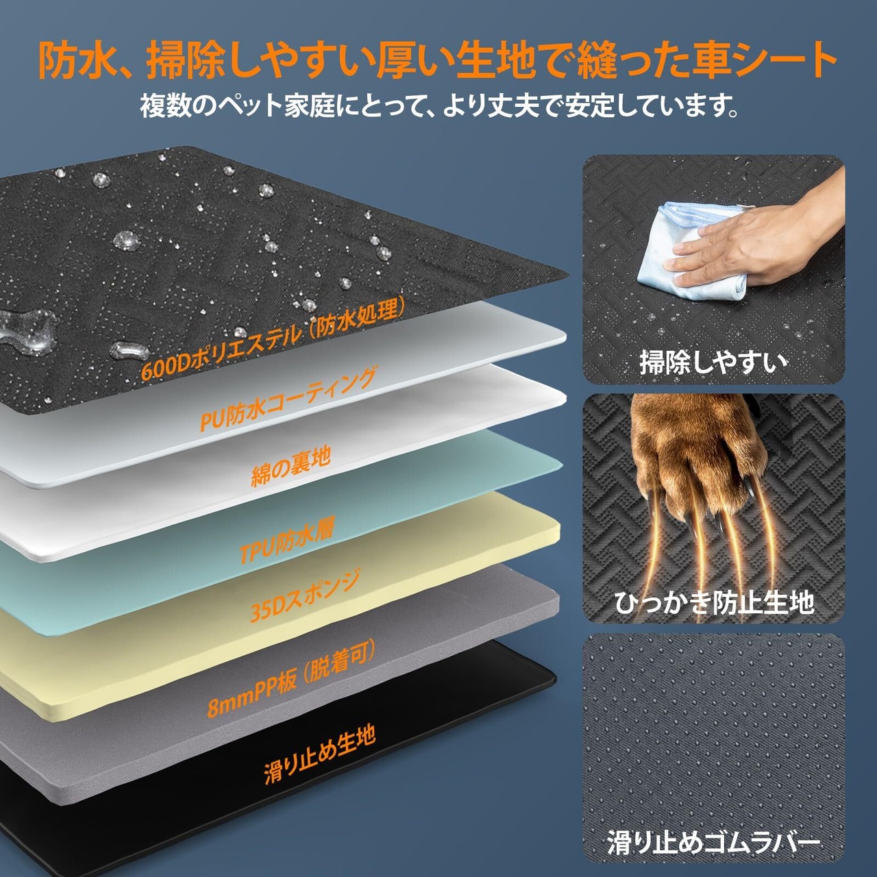 【7層構造の素材・100%防水・滑り止め・耐久性】ペットドライブシートは7層構造の材料を採用しており、生地は防水処理され、裏面の生地は滑り止め処理され、犬用車シートは非常に丈夫で耐久性があります。 表面の生地は模様とスクラッチ防止処理で、ペットの滑り止めと同時に車 ペットシートを傷つけないようにしています。