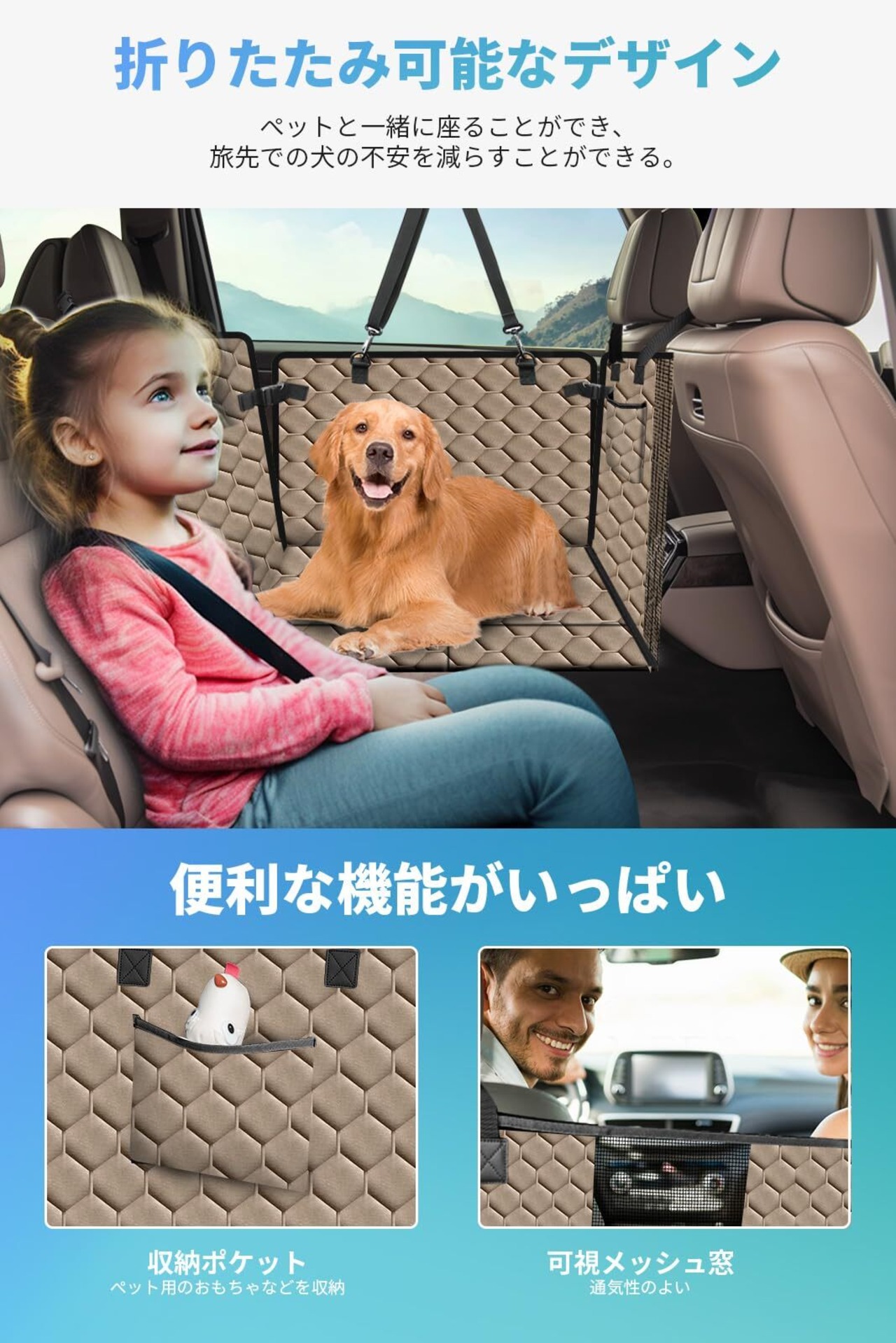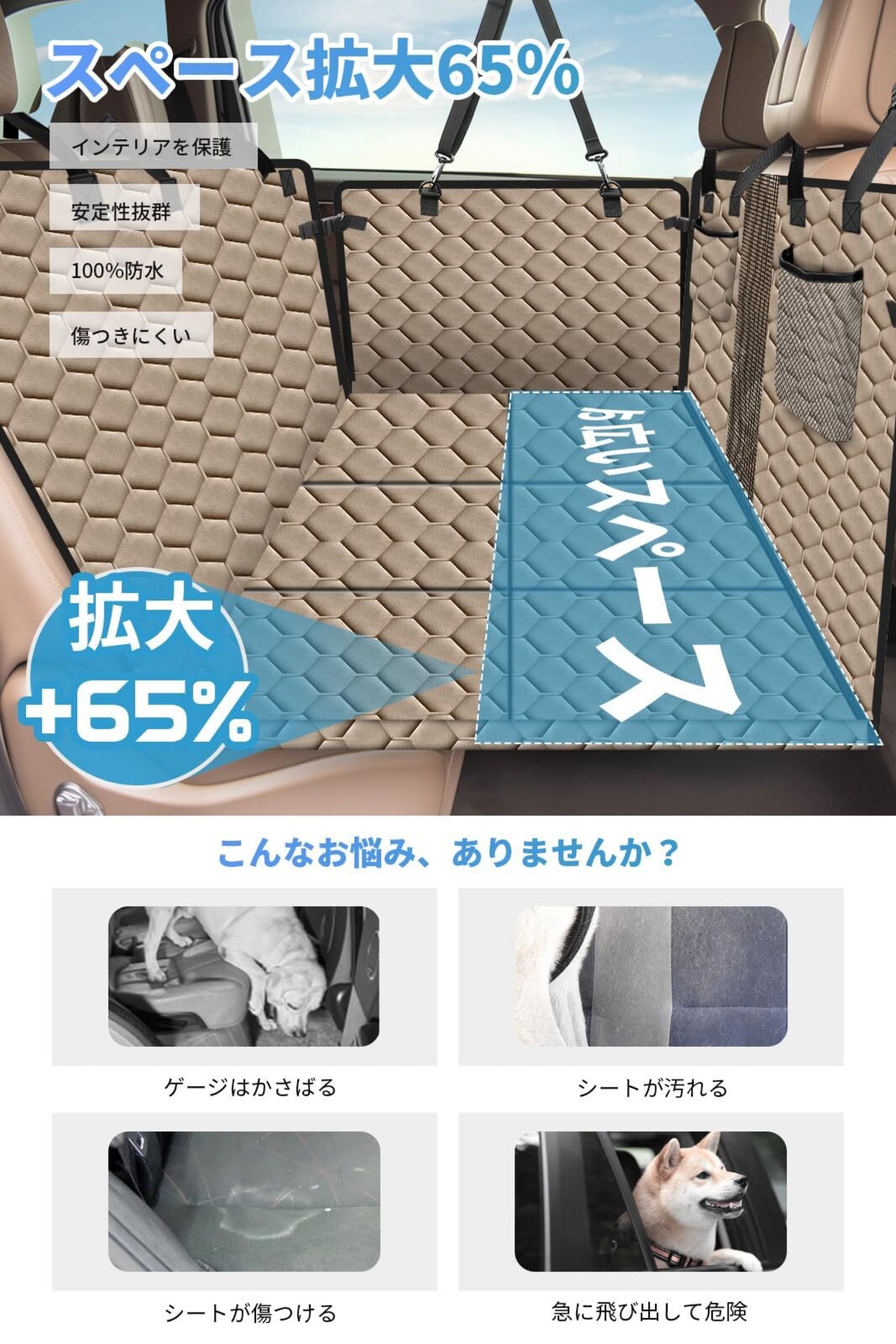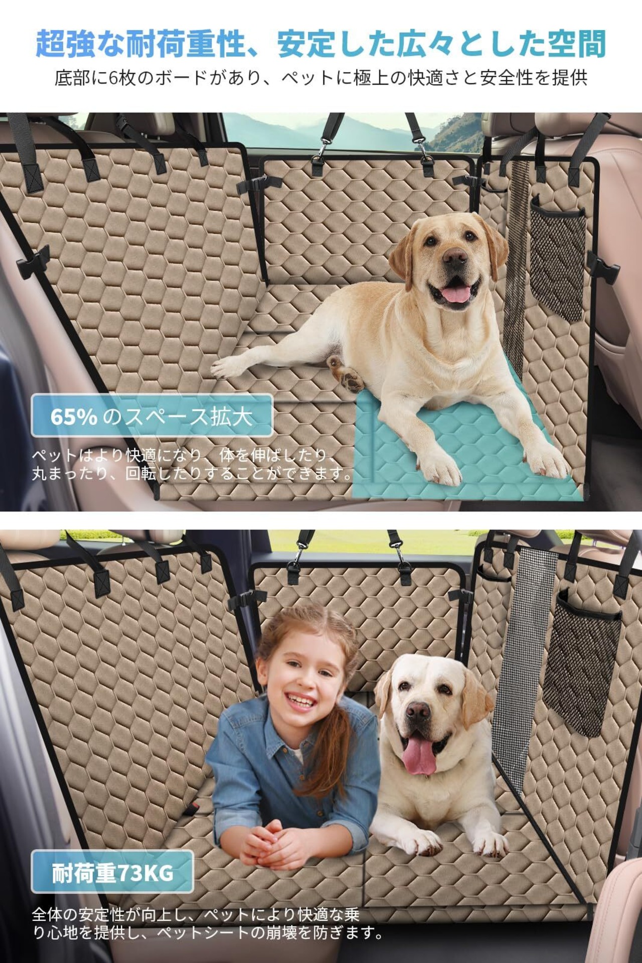 【安定した広々空間】底部に6枚の補強ボードを使用し、ペットドライブシートの崩れを防ぎ、安定感を向上させました。従来よりも65%広く、ペットが快適に伸びたり、丸まったり、自由に動き回れます。