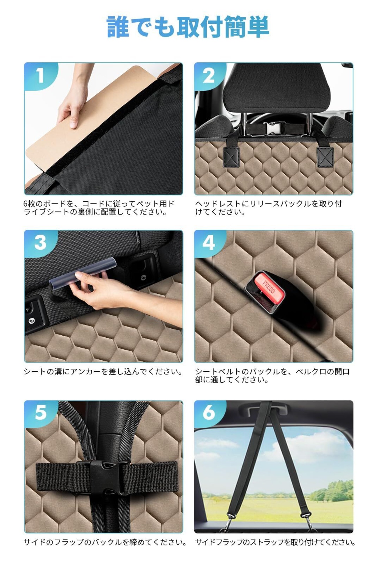 【簡単取り付け&折りたたみ式】わずか5分で簡単に取り付けできます。補強ボードをセットし、バックルでヘッドレストに固定するだけ。折りたたみ可能なので、ペットと一緒に後部座席に座ることもでき、旅行中の不安を軽減します。