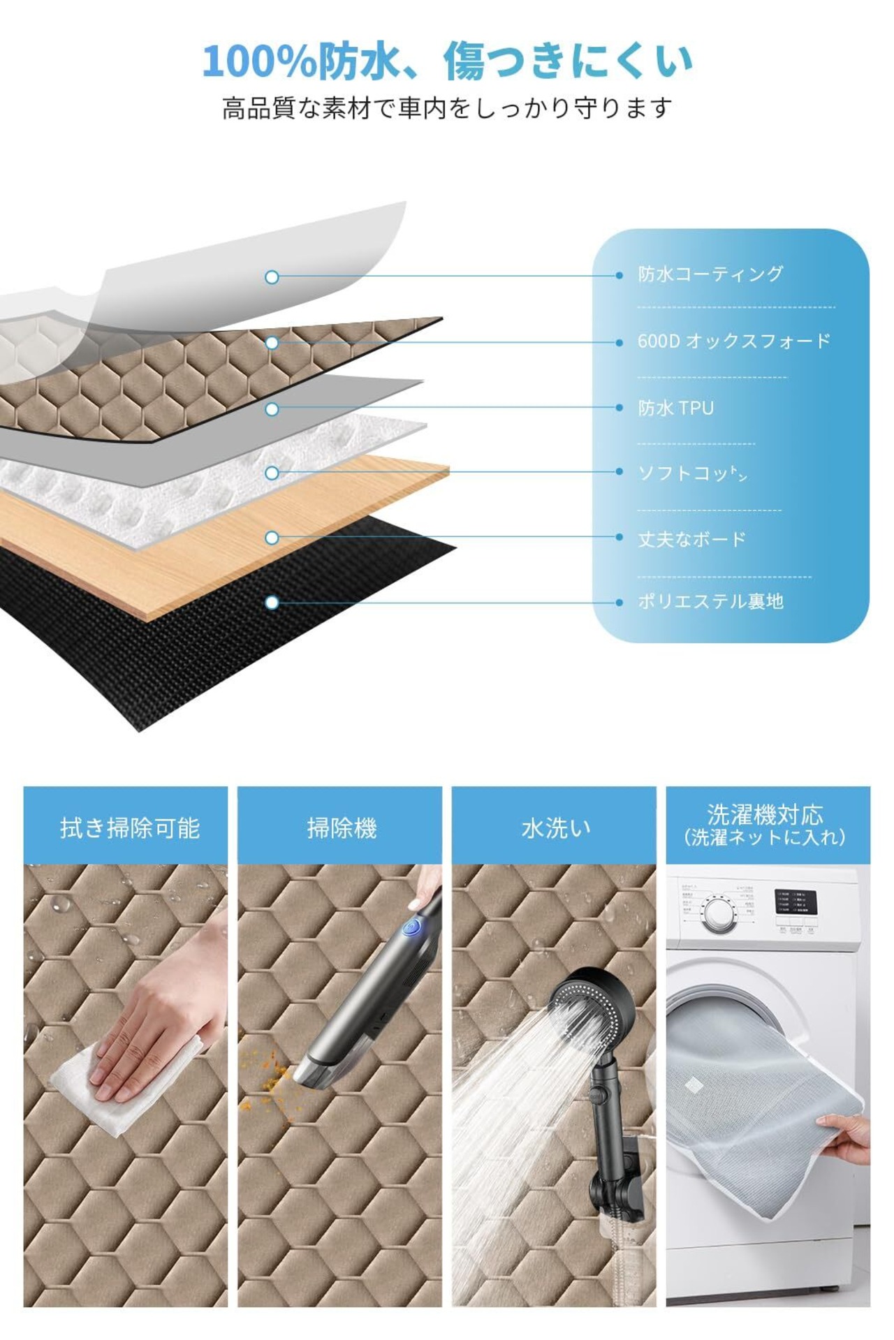 【高耐久&お手入れ簡単】600Dオックスフォード生地を採用し、防水・耐傷性に優れており、車を汚れや傷から守ります。シートは水拭きや掃除機で簡単に清掃でき、常に車内を清潔に保つことが可能です。