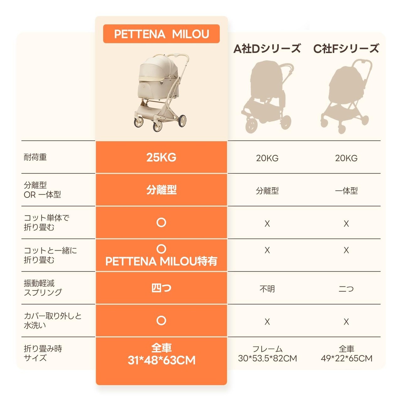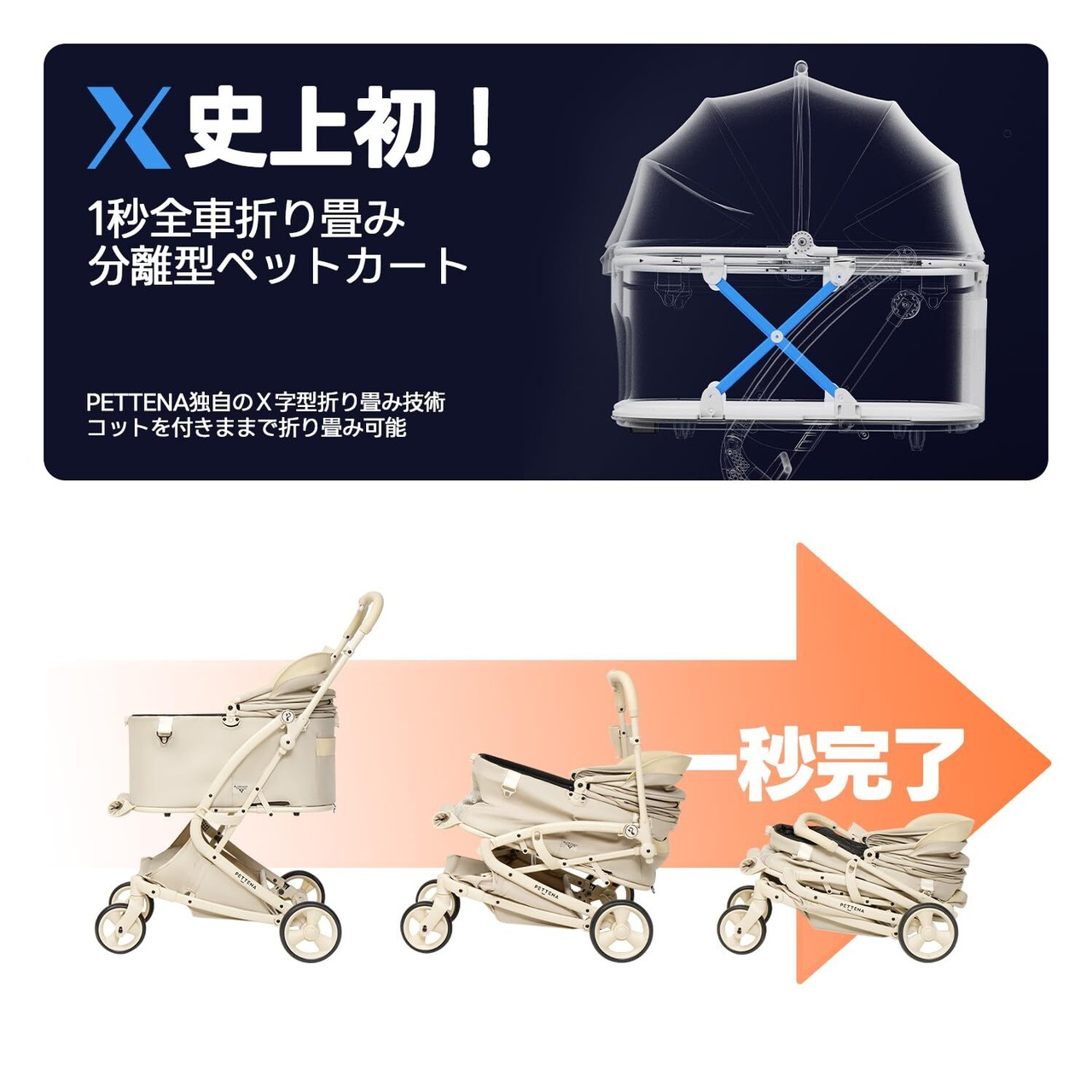 【PETTENA最上級モデル「MILOU」・真実の一秒全車折り畳み】PETTENA最上級モデル「MILOU」は、お客様の「折り畳むたびにコットを取り外すのが面倒」という声から生まれた革命的なペットカートです。独自開発の「X型折り畳み技術」により、他社製品のようにコットを取り外して手動で折りたたむ必要がなく、コットを付けたままの状態でワンタッチ1秒折り畳みを実現。従来の分離型ペットカートでは数分かかっていた作業が、たった1秒で完了します。急な雨や電車での移動時でもサッと収納可能で、耐荷重25kgの頑丈さと業界初の瞬時折り畳み機能を両立した、PETTENAが誇る最上級モデルです。飼い主様のストレスを徹底的に解消する、真に便利なペットカートの誕生です。