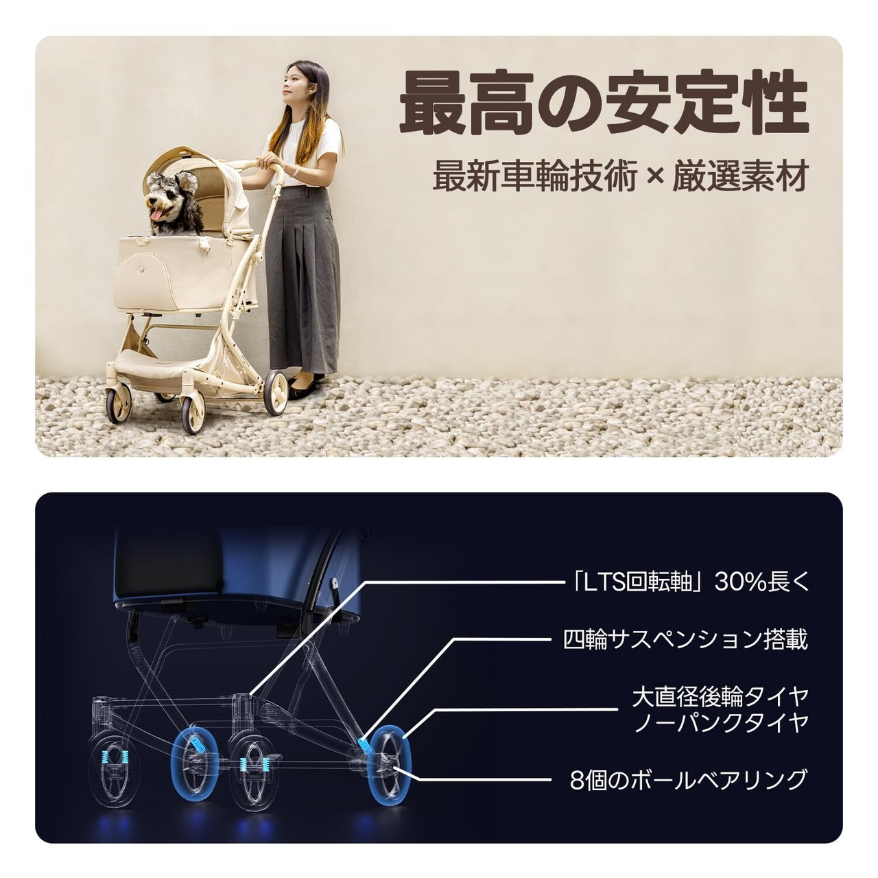 ️【EN1888基準適合&最高水準の安定性】PETTENA犬用カート「MILOU」は、ベビーカーと同等の厳格なヨーロッパ安全規格「EN1888」に完全適合。業界トップクラスの72,000回耐久テストをクリアした確かな品質です。15cm大口径フロントホイールと17.5cm超大口径リアホイールの組み合わせで、あらゆる路面状況をスムーズに走行。さらに、四輪すべてに衝撃吸収スプリングを採用したことに加え、従来モデル比30%延長した回転軸と8個のボールベアリングを内蔵した特殊設計の駆動構造により、段差衝撃の緩衝性能と旋回時の接地面保持性能が大幅に向上。路面状況の変化に左右されない卓越した走行安定性を実現しています。ペットの安全と快適さを徹底的に追求した設計で、毎日のお散歩がもっと楽しく、もっと安心に。PETTENAが誇る最上級モデルならではの走行性能をお楽しみください。