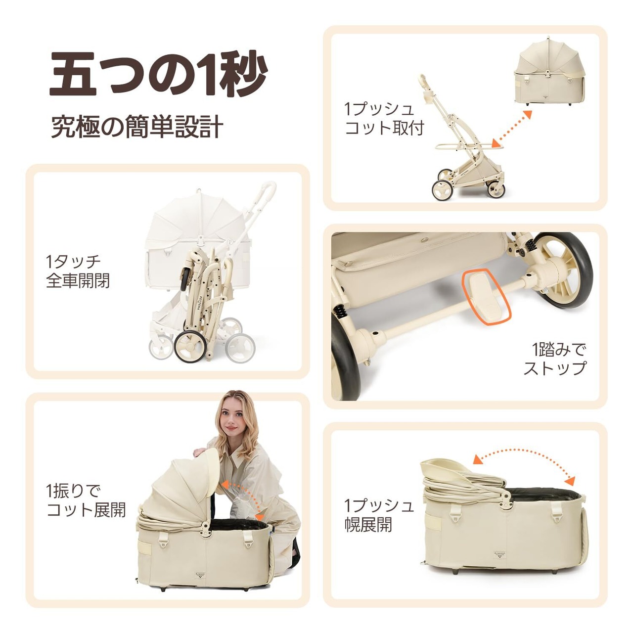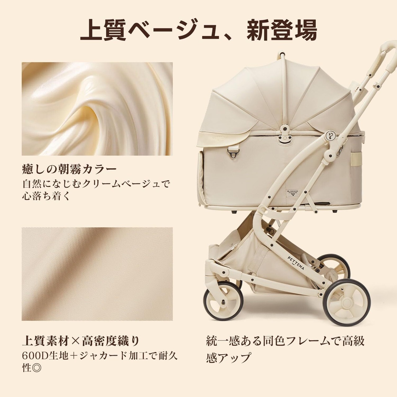 【五つの1秒、超絶便利】PETTENAペットカートMilouは、飼い主様の「もっと簡単に使いたい」という願いを叶える革命的なデザインです。1秒開閉:独自X型フレームでコット付きままワンタッチ展開/収納。1秒でコット取り付け:しゃがまずプッシュするだけのコットのアタッチメント。1秒展開:振るだけで自動的に展開が完成。1秒ストップ:足元操作で瞬時安定停止。1秒幌調整:晴雨対応ワンプッシュ開閉。公園散歩から街中の移動まで、あらゆるシーンでストレスフリーな使用感を実現。これまでにない利便性と機能性を兼ね備えた、PETTENAが誇る最高峰のペットカートです。お客様の「できたらいいな」を形にした、真に便利なペットライフの新基準をご体験ください。