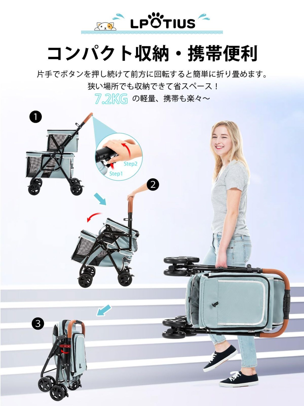 LPOTIUS ペットカート 多頭 上下2段式 ペットバギー ワンタッチ 折りたたみ 犬用ベビーカー コンパクト 収納便利 4輪 前輪360°回転 後輪ブレーキ付き 軽量 犬用カート 小型犬 中型犬 犬猫兼用 耐荷重20KG 上段8KG 下段12KG 多頭飼い対応 お出かけ 散歩 通院 介護用 ドッグカート 組み立て簡単(ブルー)