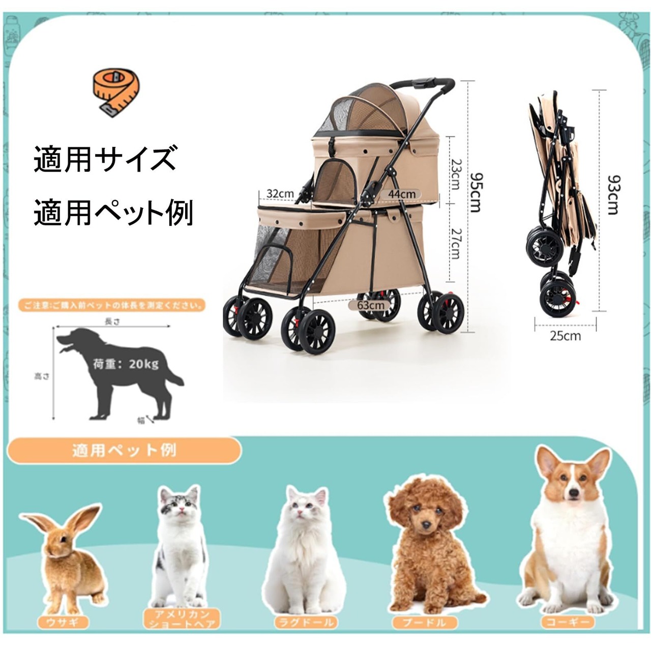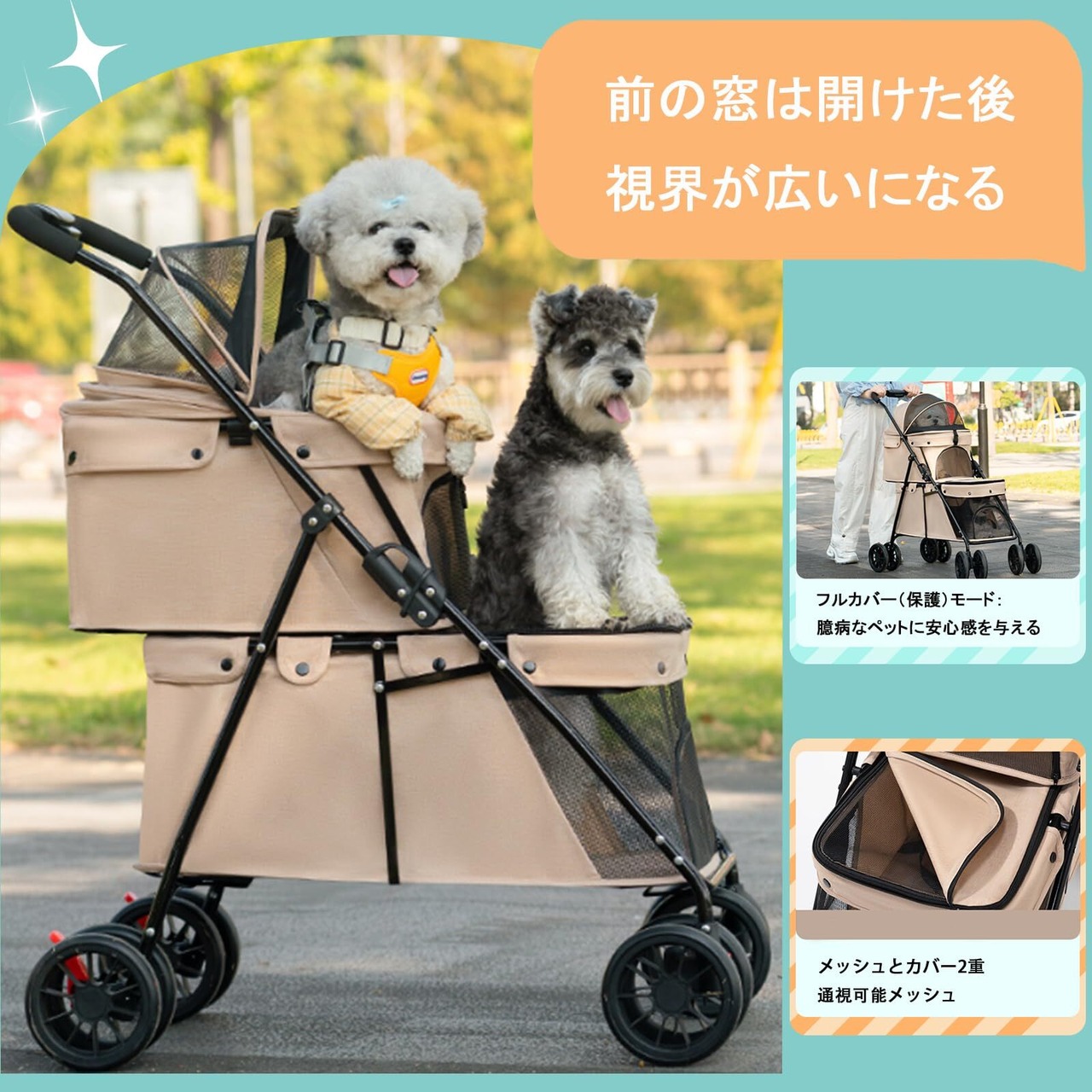[SAQIANRE] ペットカート 折り畳み式 多頭 上下2段式 ペットバギー ワンタッチ 犬用ベビーカー コンパクト 収納便利 4輪 前輪360°回転 後輪ブレーキ付き 猫 小型犬多頭 中型犬 犬猫兼用 ドッグカートお出かけ 散歩 通院 介護用 (ブラウン)