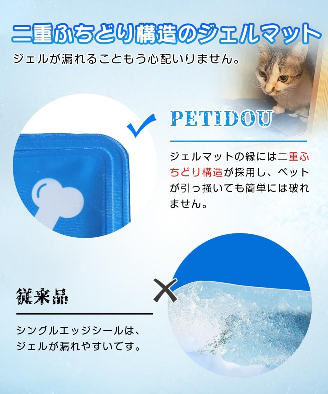 【二重ふちどり構造&ホットプレス技術&漏れにくい】ジェルマットの縁には二重ふちどり構造が採用しており、ペットが引っ掻いても簡単には破れません。枕の充填材が漏れることもう心配いりません。中間のペットクールマット部分では、ホットプレス技術を採用し、接続をしっかりさせ、ゲル漏れを防止します。※噛み癖のあるペットさんにはお勧めしません。