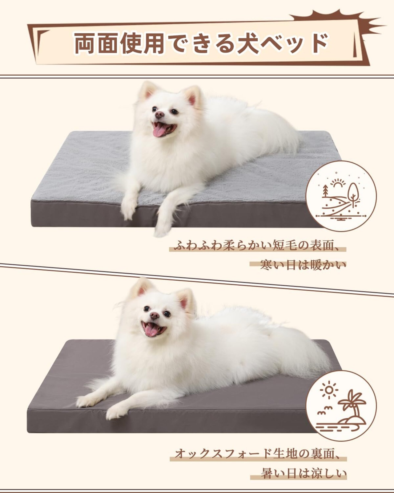 【両面使用可能】犬ベッドの底はオックスフォード生地でできており、丈夫で洗濯に強く、日常的な摩耗に耐えます。寒い日は気持ちいい短毛の表面を使え、ソフトで保温性抜群、ワンちゃんは暖かく過ごせます。暑い日は裏のオックスフォード生地の面を使え、通気性がよく、ワンちゃんは涼しい夏の日を過ごせ、超嬉しいですよ。