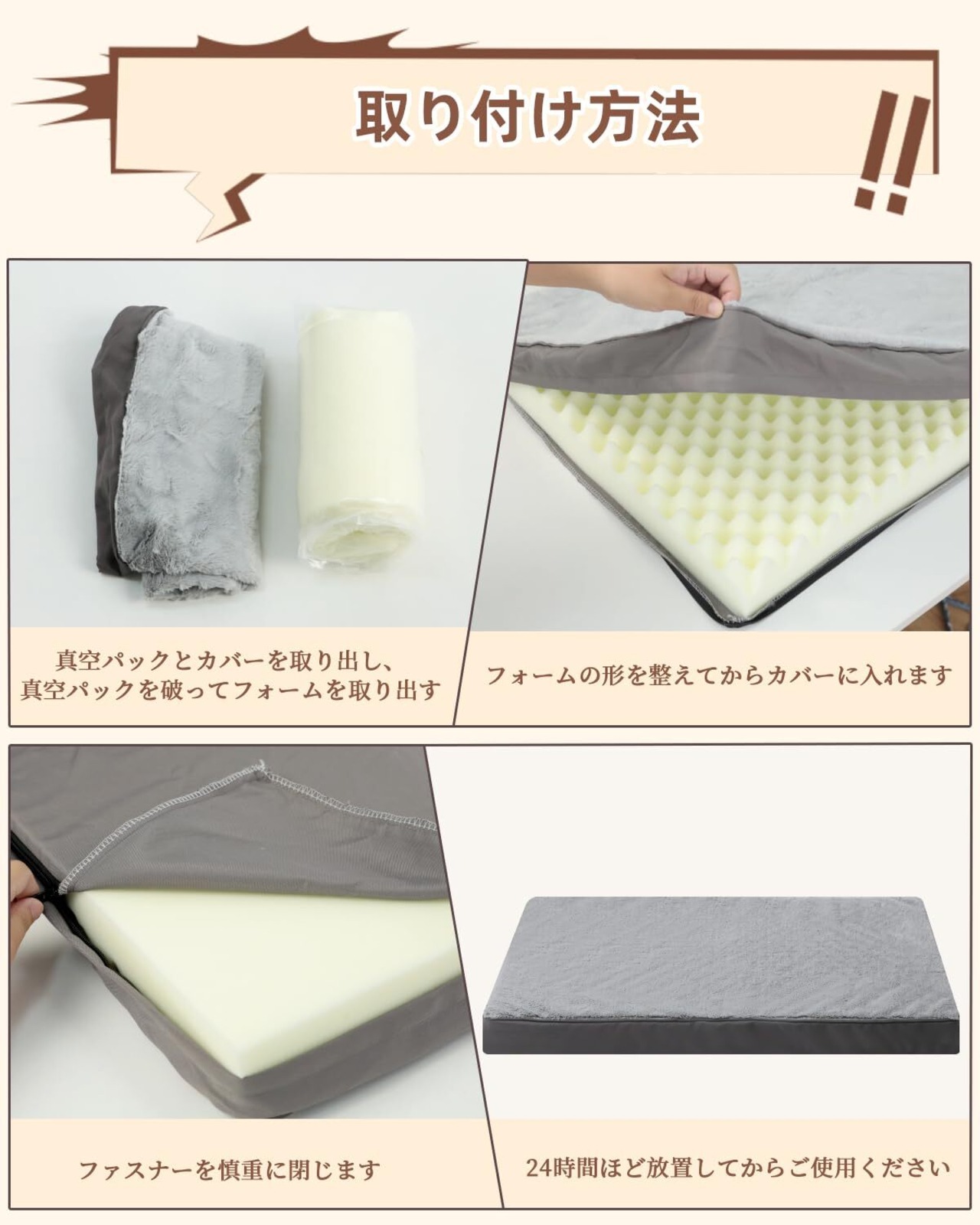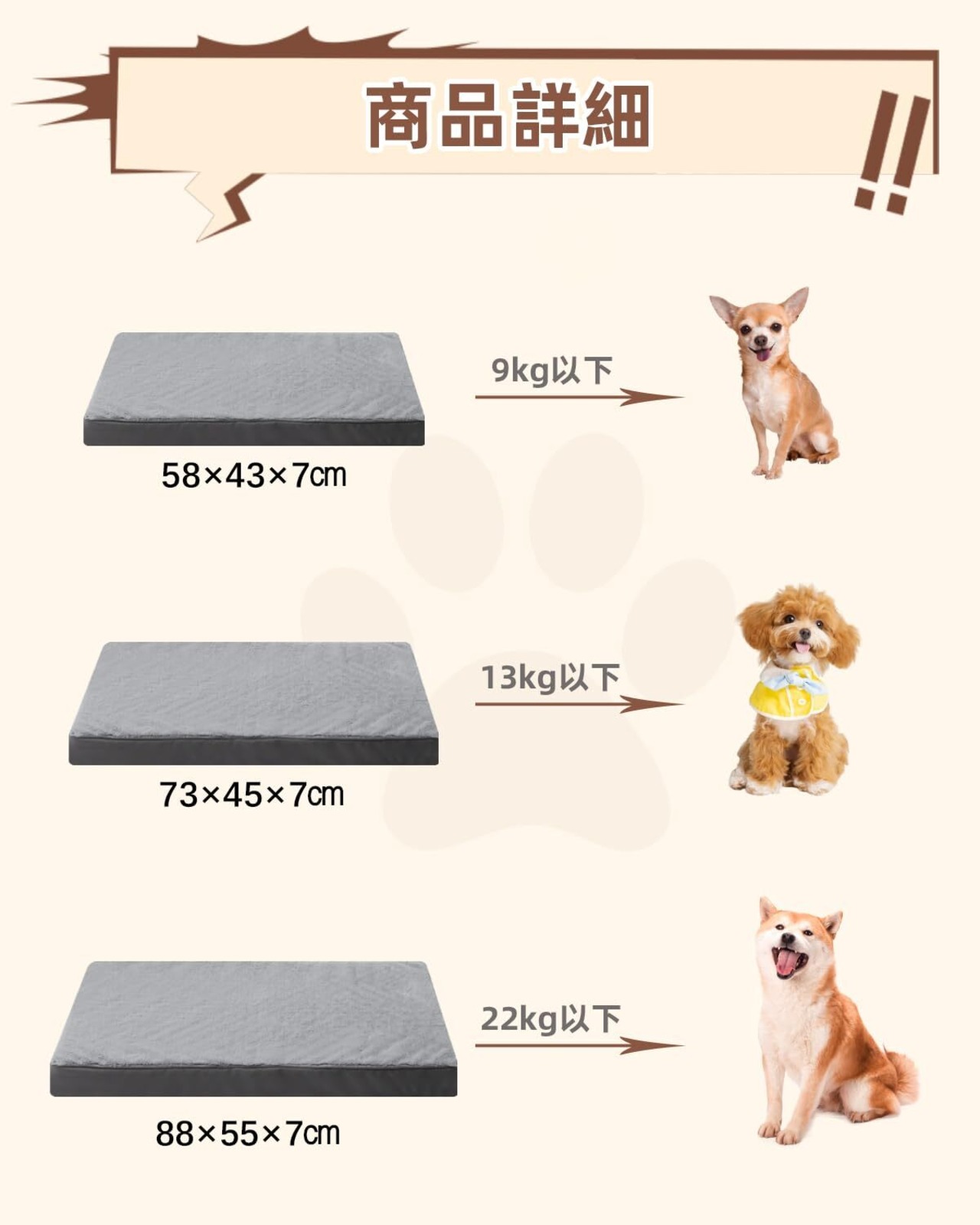 【製品サイズ】パッケージ内容:エッグクレートフォーム×1、カバー×1、取扱説明書×1。サイズ:58×43×7 cm。ペットベッドが真空パックされてお届けしますので、開封後に24~48時間ほど放置してからカバーに入れてご使用ください。商品が到着時に万が一破損・汚損また使用中にご不明な点がございましたら、お気軽にお問い合わせください。