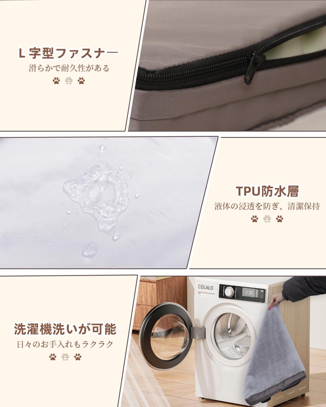 【洗える取り外し可能なカバー】犬ベッドのカバーは快適な3層の複合生地を採用し、表面のPVベルベットはソフトで肌に優しく、間のTPU防水ライナーは液体の浸透を防ぎ、内側のニット生地の裏地は十分な耐久性があります。カバーは隠しL字型のファスナーが付き、汚れても簡単に取り外して洗濯機洗いが可能です。犬ベッド中身のフォームは洗えませんのでご注意ください。