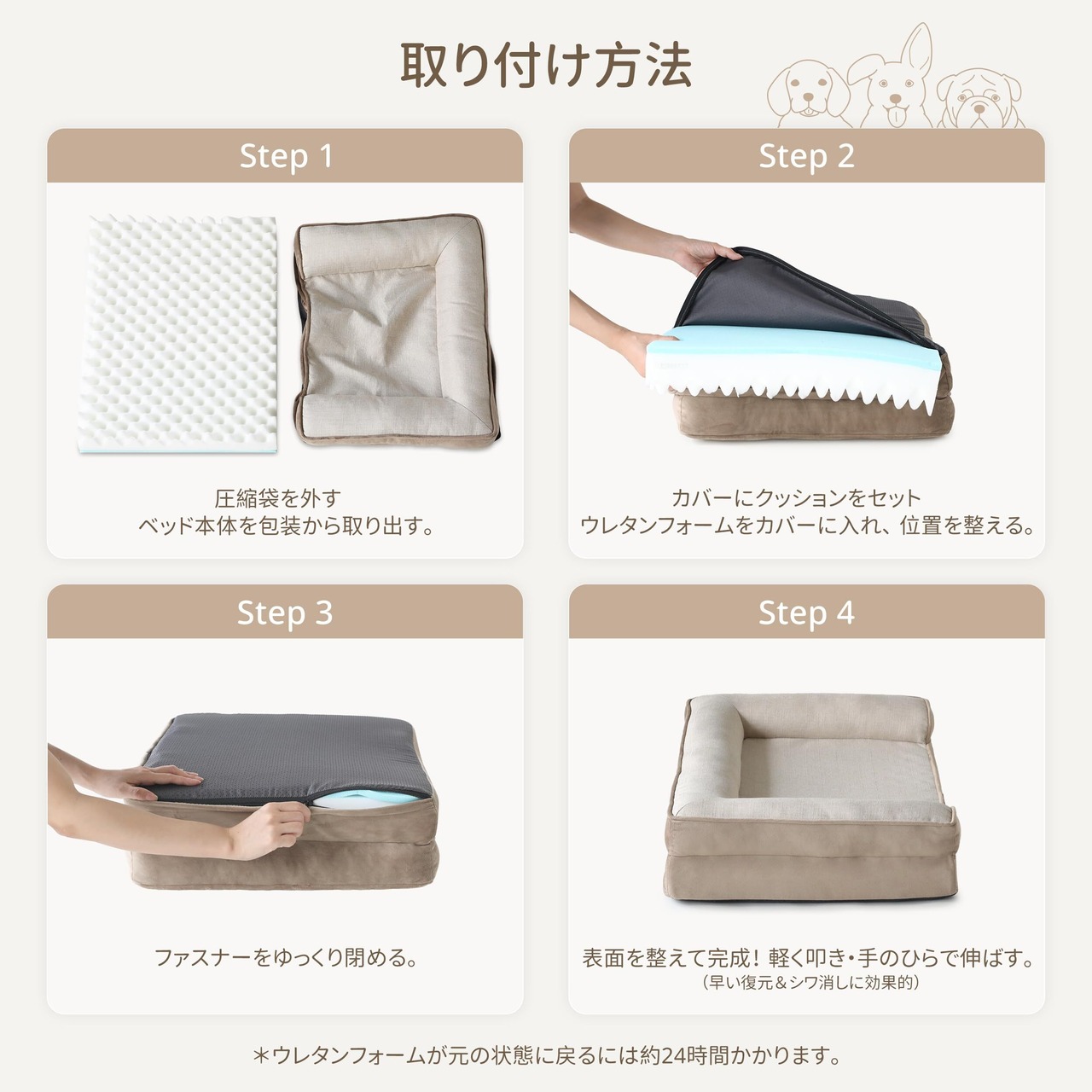 【首サポート&楽々出入り】接触面に縫い目なしの平らな3方向サポート枕が、自然な首の角度をキープし負担を軽減。市販品より広めの平坦設計で顎への皮膚摩擦を最小限に抑え、リラックスを妨げません。低床設計で関節が弱ったシニア犬も楽に出入りできます。