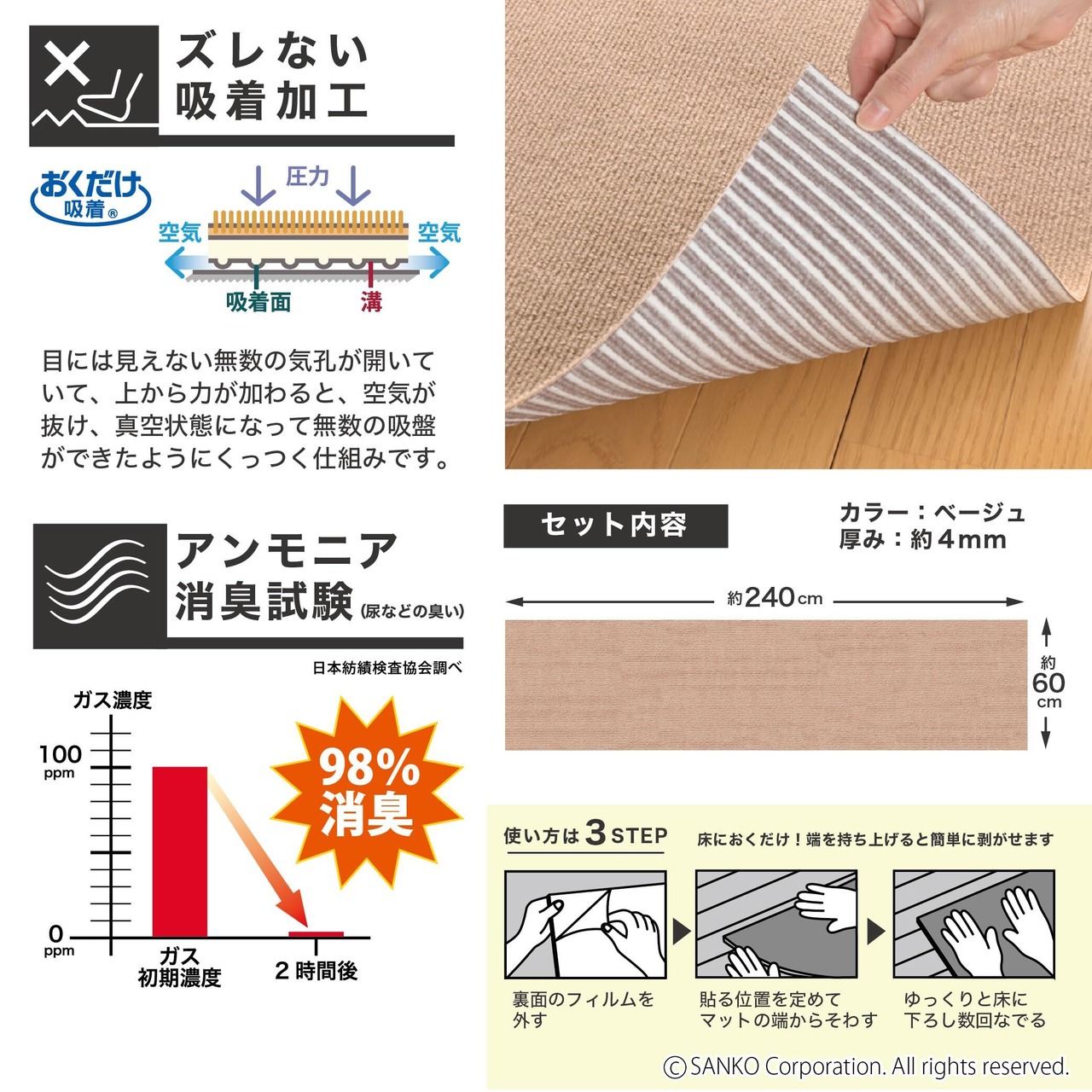 サンコー おくだけ吸着 獣医師推奨 ペット用 床保護マット 60×240cm ベージュ BE ロングマット 汚れ防止 【日本製 撥水 消臭 洗える ハサミでカット可】 KM-59
