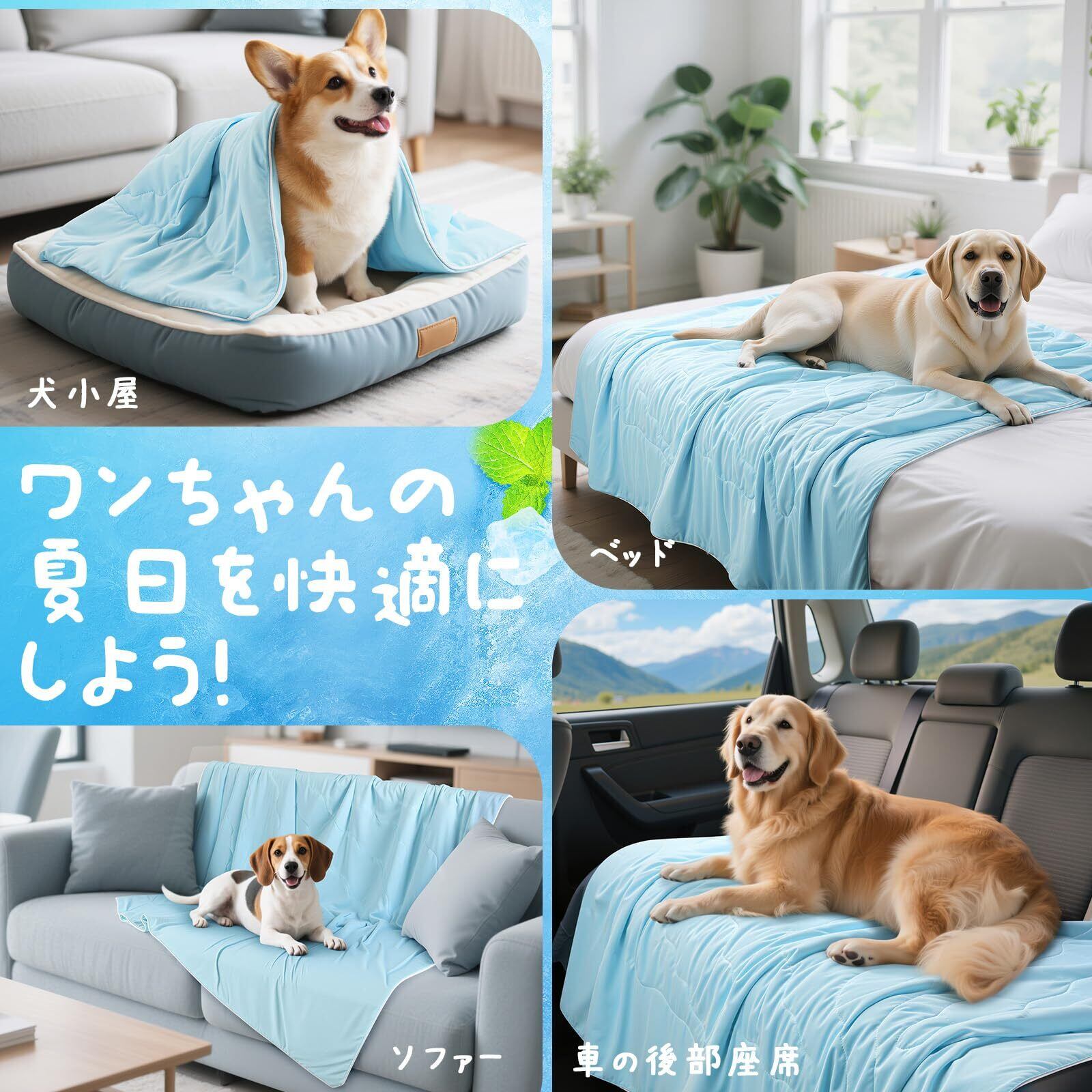 「各種の適用場面」 室内のお昼寝スペースはもちろん、車内の暑さ対策やキャンプ・旅行先でのクールダウンにも最適。夏場のベランダや冬の暖房効きすぎた部屋など、温度変化の激しい環境でもペットの快適さをサポート。折りたたんで持ち運べるため、ペット同伴の外出先や動物病院の待合室でも活躍。季節やシーンを選ばず、一年中愛用できる多機能アイテムです。