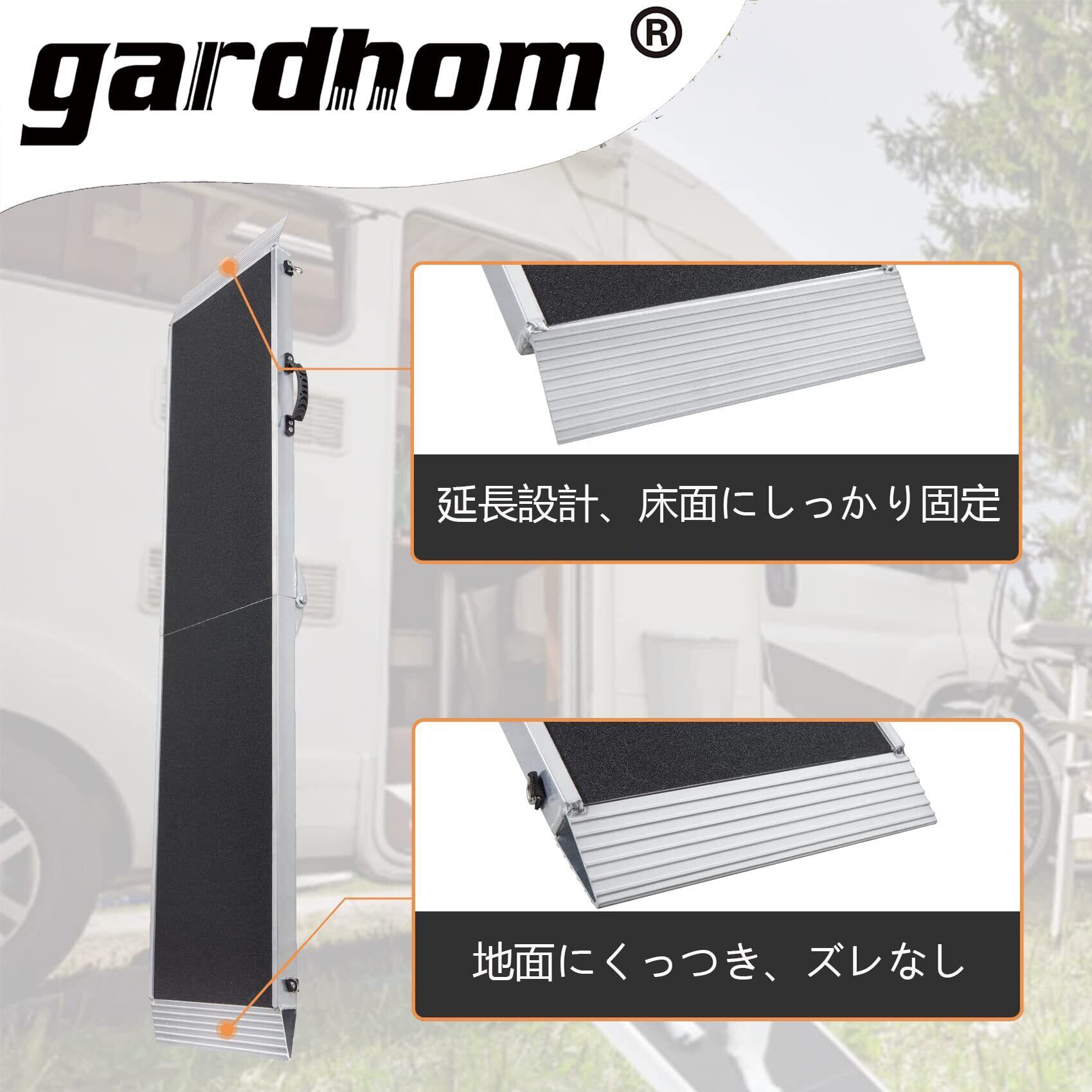 【滑り止め加工】アルミスロープ表面にエメリーパッド付き、両端の延長設計、地面にくっつき、床面にしっかり固定でき、ズレなし。折りたたみスロープの表面には滑り止めエメリーフィルムが付き、滑り止め性能を高め、ペットの足を傷つけません。