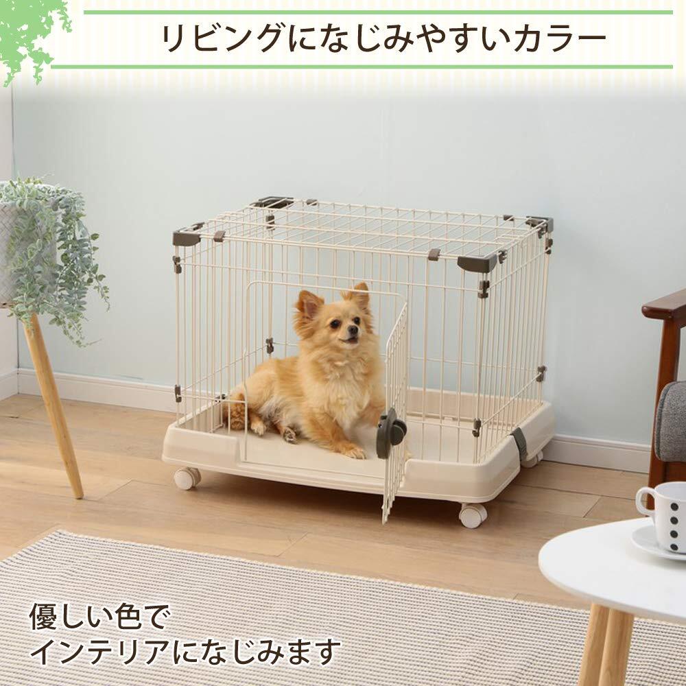 室内犬が快適に過ごせるサイズのペットケージです。ドアロックは片手で簡単に開閉できるワンタッチ式、天面扉はフルオープンタイプです。移動に便利なキャスター付きです。