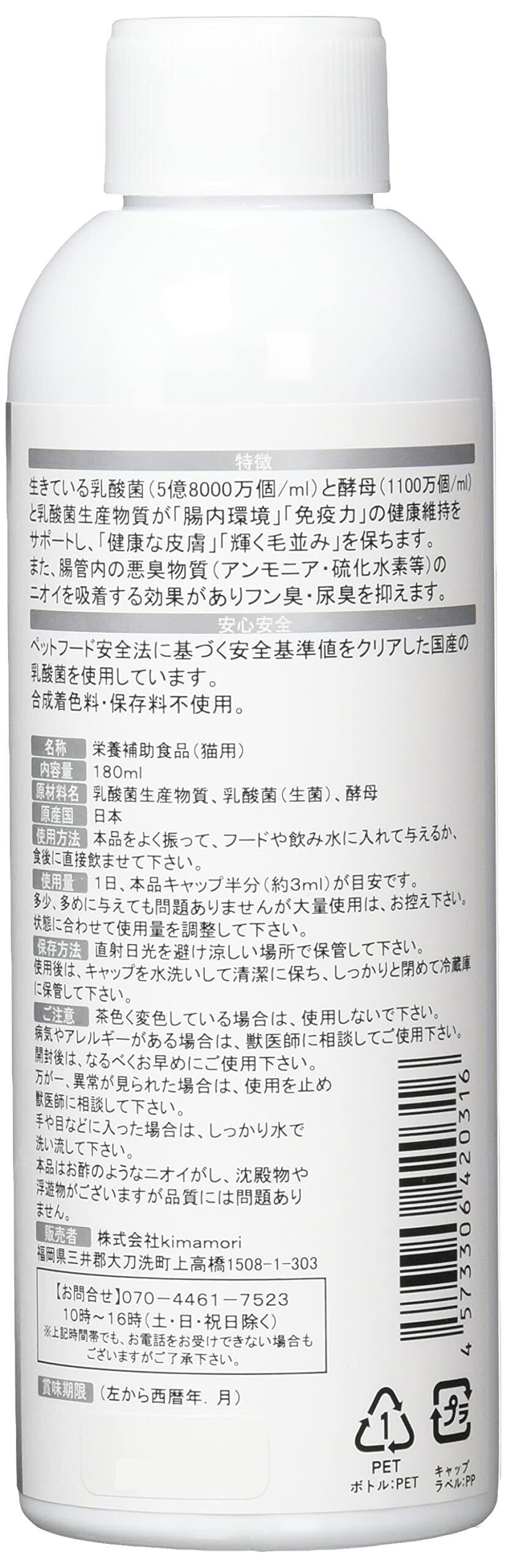生きている強力な乳酸菌(約5億8000万個/ml)と酵母(約1000万個/ml)と乳酸菌生産物質(乳酸・酢酸など)が、腸内に住みつく悪玉菌(病原菌)の増殖を抑制。 「腸内環境」「消化吸収」「免疫機能」を強力にサポートし、生体の健康を維持します。 「うんちがゆるい」「うんちのニオイ」「お口の健康」「お口のニオイ」が気になる飼い主さんや、「元気がない」「幼少期・高齢期」の善玉菌補給に。