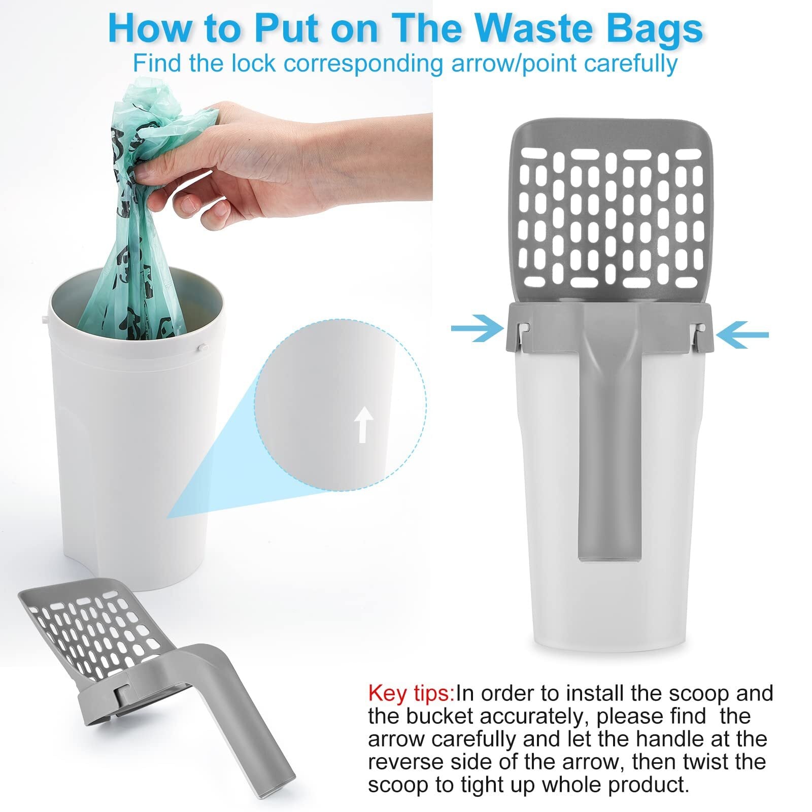 1[ホルダー付き2 IN 1スコップ]猫砂スコップ+猫砂入れ+ゴミ袋の組み合わせユニークなデザインです。掃除と回収が一体となり、シンプルなスコップだけでなく、追加の袋も付いて、片手でペットのウンチを掃除でき、便利で毎日の掃除に適しています。
