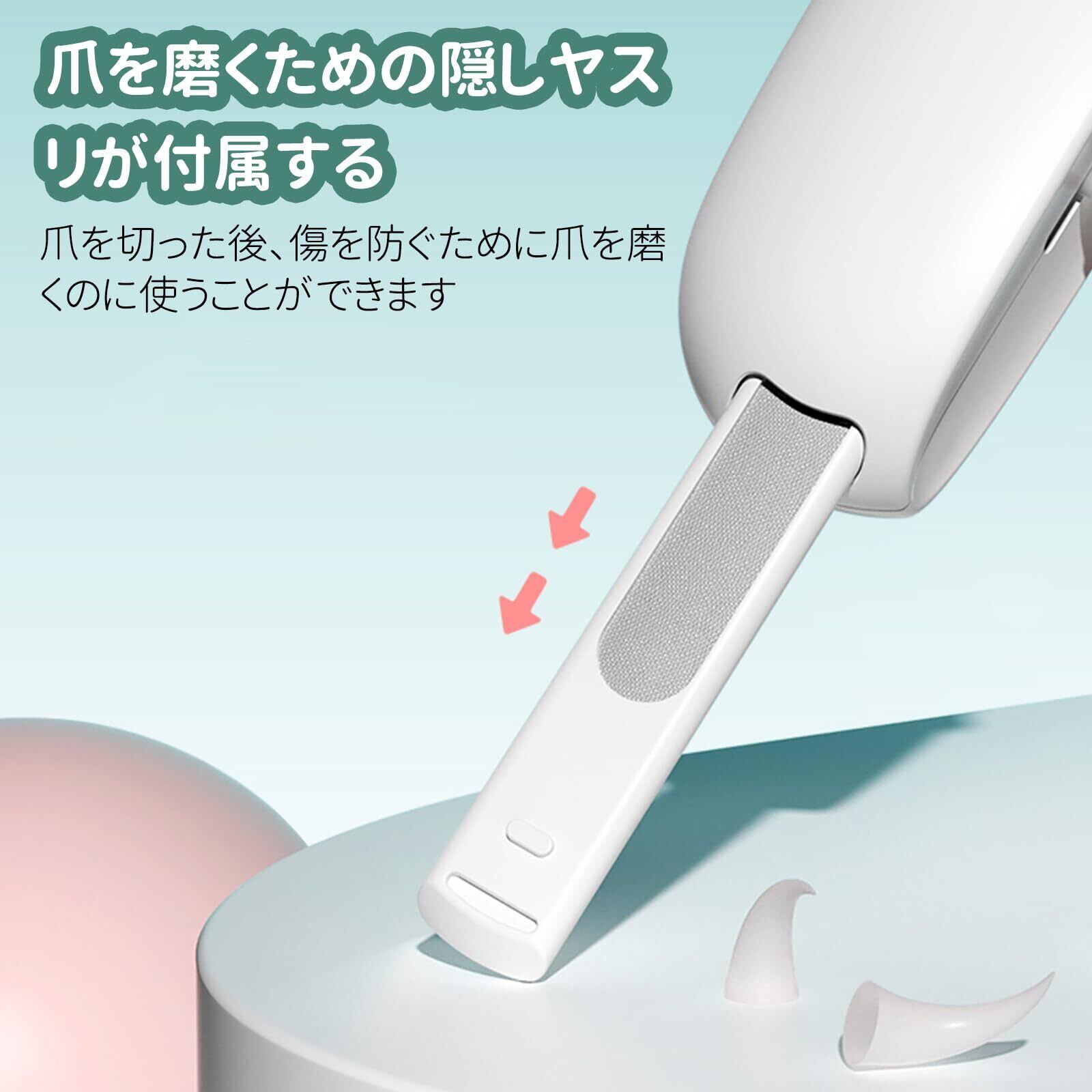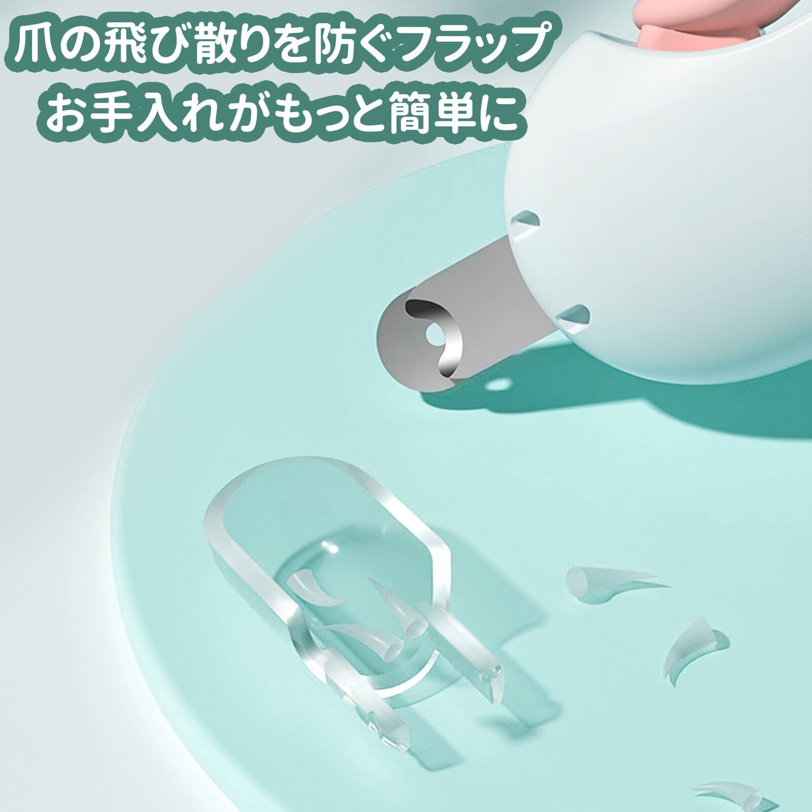 「飛び散り防止カバー」切った爪が飛び散らないように設計されたカバーが付いており、切った後の掃除が簡単です。これにより、周囲を清潔に保つことができます。飛び散り防止カバーは透明で、切る際の視界を妨げません。