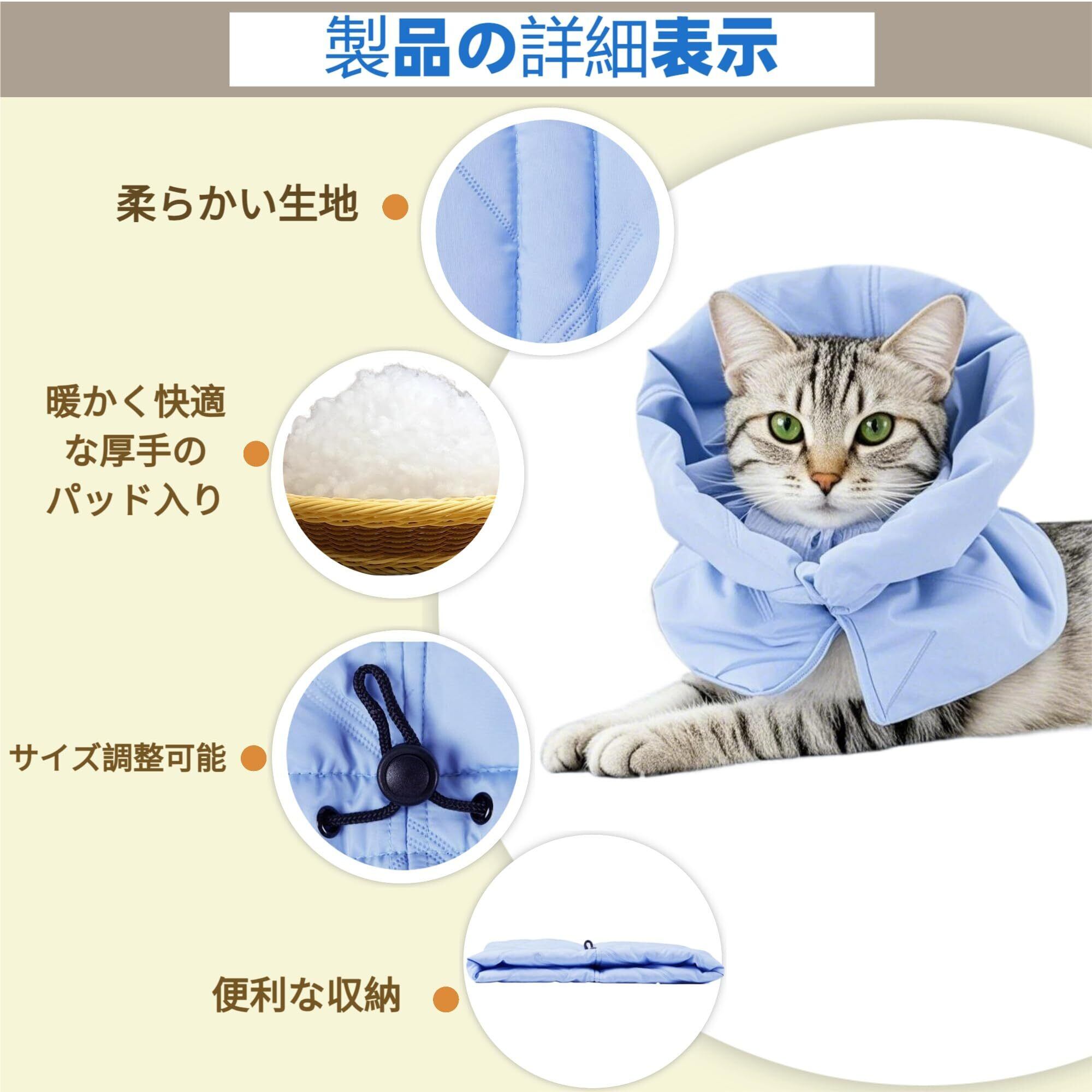 多機能なペット用品:傷舐め、引っ掻き、噛みつきなどを効果的に防ぎ、去勢手術後の傷口保護などペットの健康や回復に役立つエリザベスカラーです。また、美容、入浴、トリミングなどの日常使用にも適しています。そして中にPP綿を充填していて、エリザベスカラーだけではなく、寒い冬に愛猫のマフラーとしても利用できます。