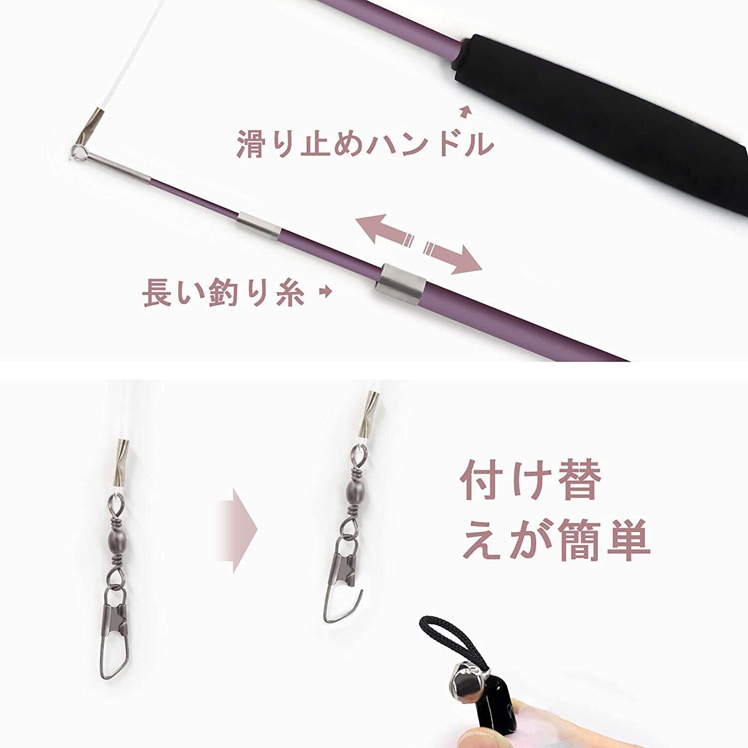 このおもちゃは、羽根の部分を簡単に交換できるデザインで、様々な遊び方が楽しめます。また、伸縮可能な釣り竿は、使用シーンに応じて調整できるため、室内でも屋外でも大活躍です。