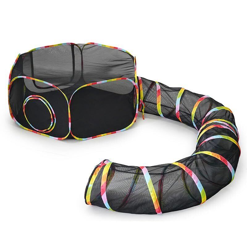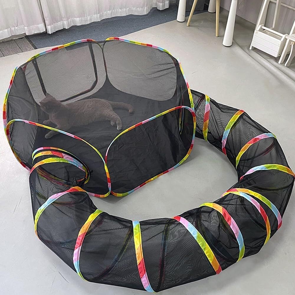 本商品の120cmペットサークルは、猫ちゃんが自由に走り回ったり探索できる広々としたスペースを提供します。315cmの長いトンネルが付属しており、猫たちが楽しめる遊びの数々を実現します!