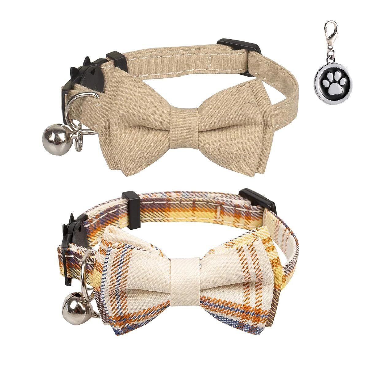 猫 首輪 ネコ 猫用 首輪 子犬 迷子札付き リボン付き 鈴付き セーフティバックル 可愛い 調整可能 軽量 ペット首輪 2個セット (ベージュ+チェックベージュ)