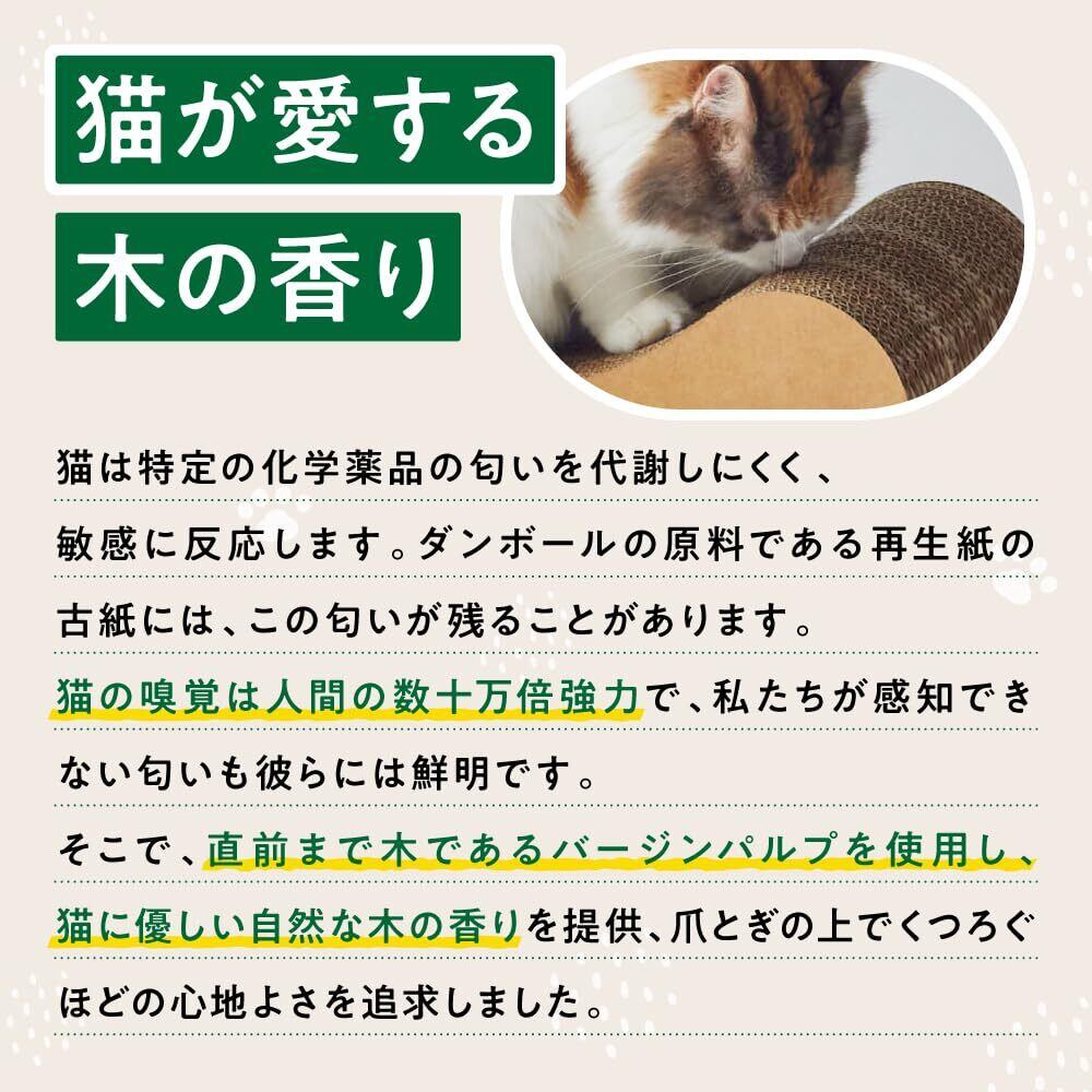 ⦅純日本製で大切な猫ちゃんにも安心⦆ニャンズの 爪研ぎ は、直前まで木のバージンパルプを使用することで、猫ちゃんの本能が喜ぶ「木の香り」を実現。純日本製の強化ダンボールを1枚1枚手張りしながら制作しており、大切な猫ちゃんにも安心してご使用いただけます。
