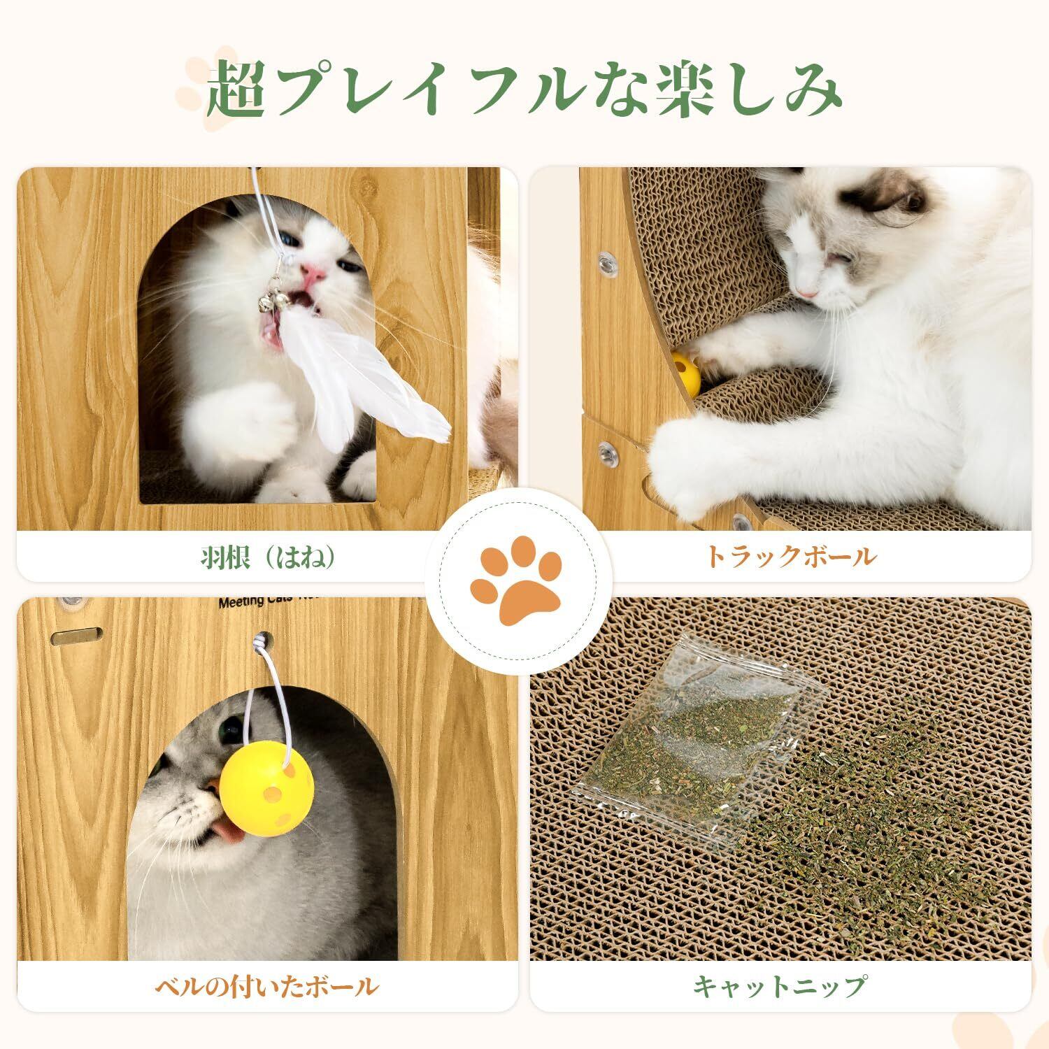 遊びを充実させる付属品:トラックボール、羽、鈴付きで、猫の好奇心を刺激。猫 つめとぎだけでなく、狩猟本能を満たす理想的な猫つめとぎハウスです