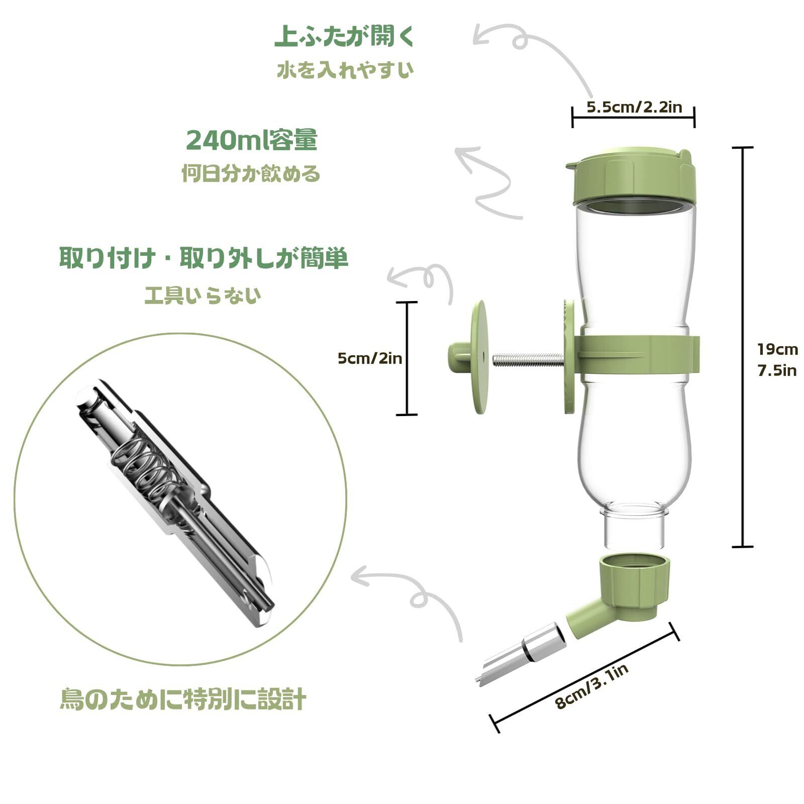 【使いやすい鳥用給水器】240mlの容量を持つこの給水器は、特別な針型の注ぎ口が設計されており、鳥が触れるだけで水を自動的に飲むことができます。手間いらずで、便利に水分補給ができます。