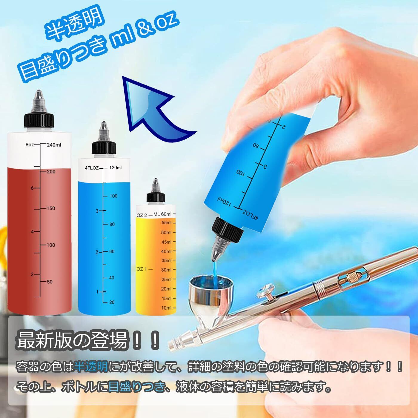 ●最新版発表!!容器の色は半透明にが改善して、詳細の塗料の色の確認可能になります!!その上、ボトルに目盛りつき、液体の容積を簡単に読みます。