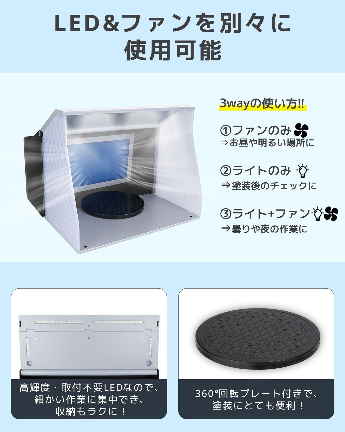 LEDライトとファンを独立に:ブースにはファンスダイヤルとLEDライトスイッチを搭載しており、それぞれを個別に使用可能。塗装作業はもちろん、パーツのヤスリがけや塗装後の仕上がりチェックにも便利です。さらに高輝度LEDは取付不要なタイプなので、収納や設置の手間がかかりません。