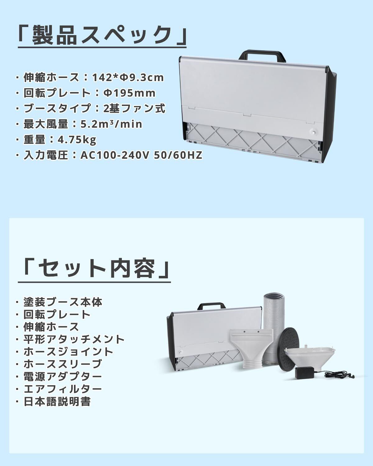 この塗装ブースは、2基のファンによって塗料の飛散を効果的に吸引し、清潔な作業環境を提供します。延長用排気ダクトが付属しており、煙やミストを屋外へしっかり排出可能です!快適で安全な塗装作業を実現します。